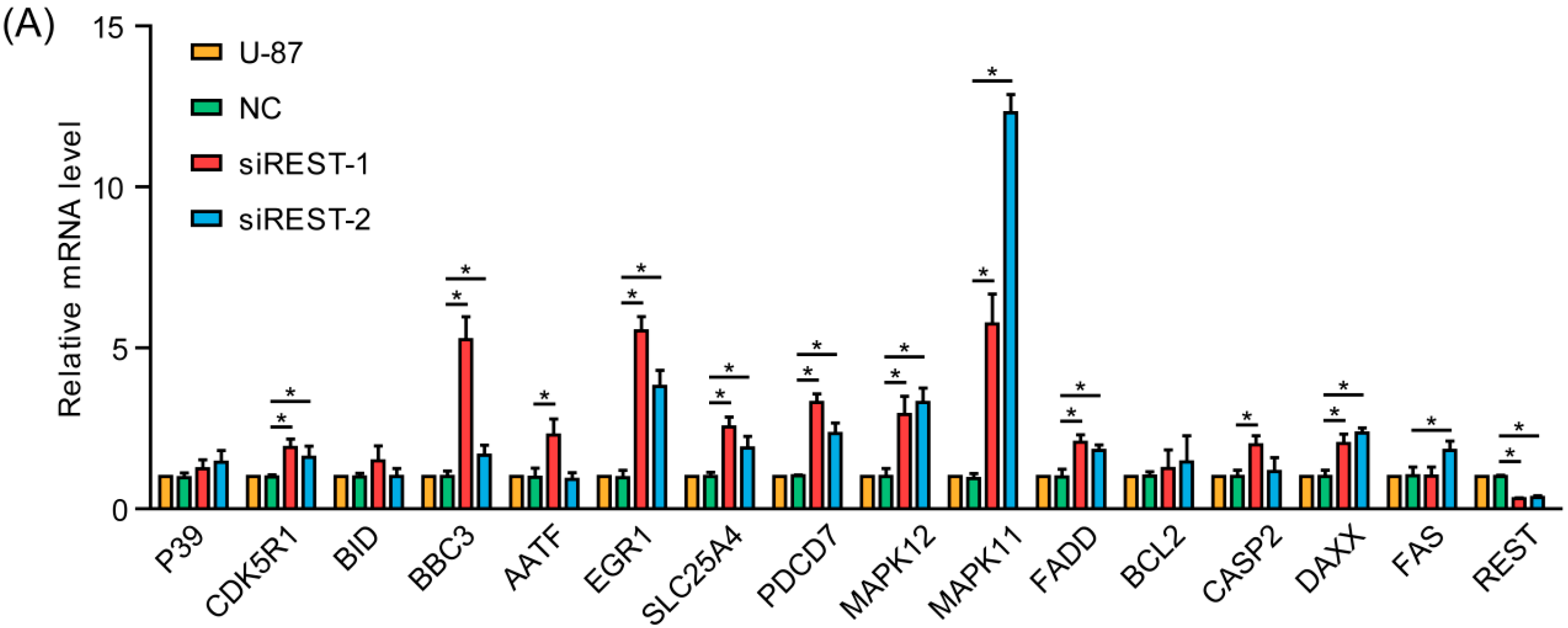 GO (Gene Ontology) analysis and Pathway analysis of these REST-downstream genes showed significant enrichment for genes in the MAPK pathway and genes that are associated with cell survival, which could potentially explain the observed phenotypes in response to REST siRNA treatment. Among these genes, CCND1 and CCNE1 act as key regulators of the cell cycle, which are upregulated during G1–S transition [21]. The down-regulation of these two genes upon REST silencing accounted for the cell cycle arrest at the G1 phase in U-87 and U-251 GBM cells. Upregulated MAPK11 and MAPK12 are two of the four p38 MAPKs that play important roles in the cellular responses evoked by extracellular stimuli, and MAPK12 plays a role in repressing cell proliferation through the down-regulation of cyclin D1 in response to hypoxia in adrenal cells [22]. At the same time, CDK5R1 is a neural specific activator of CDK5, which could regulate glioblastoma cell migration and invasion [23]. It was also reported that the suppression of the transcription factor EGR1 is a common event in gliomas, resulting cell proliferation [24], so the upregulation could contribute to the inhibition effects in GMB cells upon REST silencing. Additionally, the genes DAXX, BBC3, PDCD7, FADD and SLC25A4 all encode anti-proliferation proteins; a large number of studies have shown that the overexpression of these genes could promote cell apoptosis or necrosis. It was suggested that, partly through upregulating these genes, REST knockdown inhibited cell proliferation and migration in GBM cells.