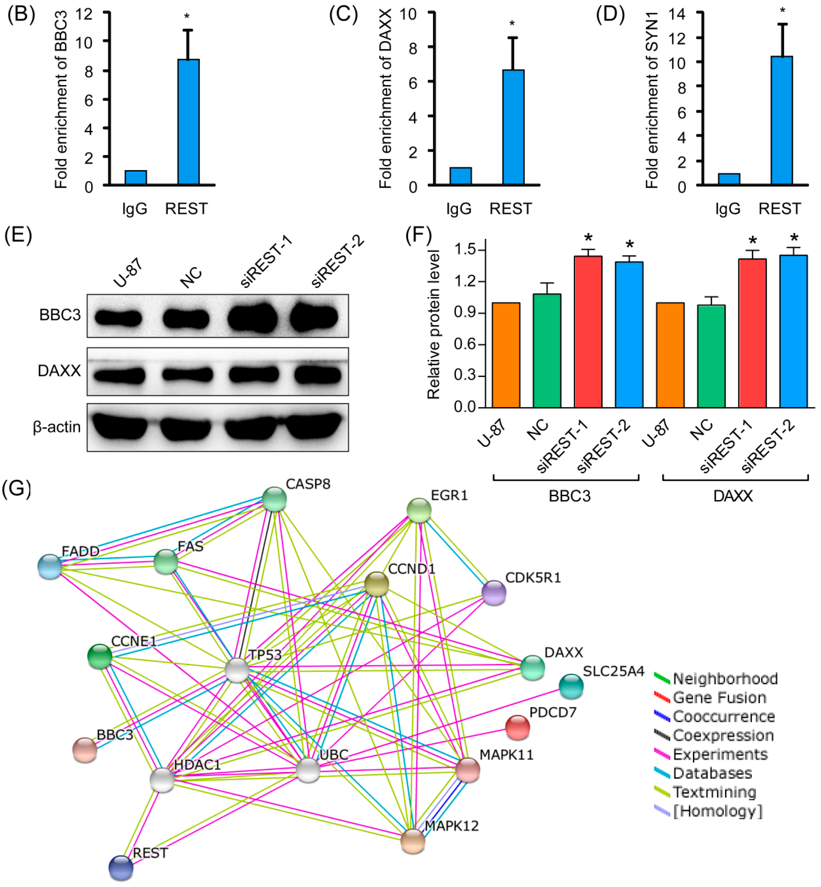 To gain more insight into the consequences of REST silencing in GBM cells, the expression of potential REST-regulated genes involved in cytostasis and migration inhibition [14,15] were analyzed by real-time PCR. As shown in Figure 8A, the mRNA levels of CDK5R1, BBC3, EGR1, SLC25A4, PDCD7, MAPK11, MAPK12, FADD and DAXX were elevated after REST knockdown, GAPDH was used as an internal control. According to the high-throughput genome-wide studies [14], among the above-mentioned REST-responsive genes, BBC3 and DAXX were shown to be potential REST-binding targets. Thus, ChIP (chromatin immunoprecipitation) assays were carried out with U-87 cells to further investigate whether REST can be bound to the promoters of these genes. The results showed significant enrichment of REST on BBC3 and DAXX promoters compared with IgG by using anti-REST antibodies (Figure 8B,C), indicating transcriptional suppression of the genes. The positive control SYN1 was also significantly enriched in ChIP (Figure 8D). Further, the upregulated expression of DAXX and BBC3 were verified at the protein level (Figure 8E,F). By using the STRING database, the interactome was generated from the identified enhanced genes, at medium confidence (0.400) parameter in order to identify highly possible connections (Figure 8G). It helps to discover the proteins playing key roles in the interactome developed from the identified proteins, and the results revealed HDAC1 and UBC as media nodes linking REST and its downstream genes. The results indicated that transcriptional up-regulation of these genes may contribute to the cytostasis and migration inhibition upon REST silencing, among which BBC3 and DAXX were direct targets of REST.