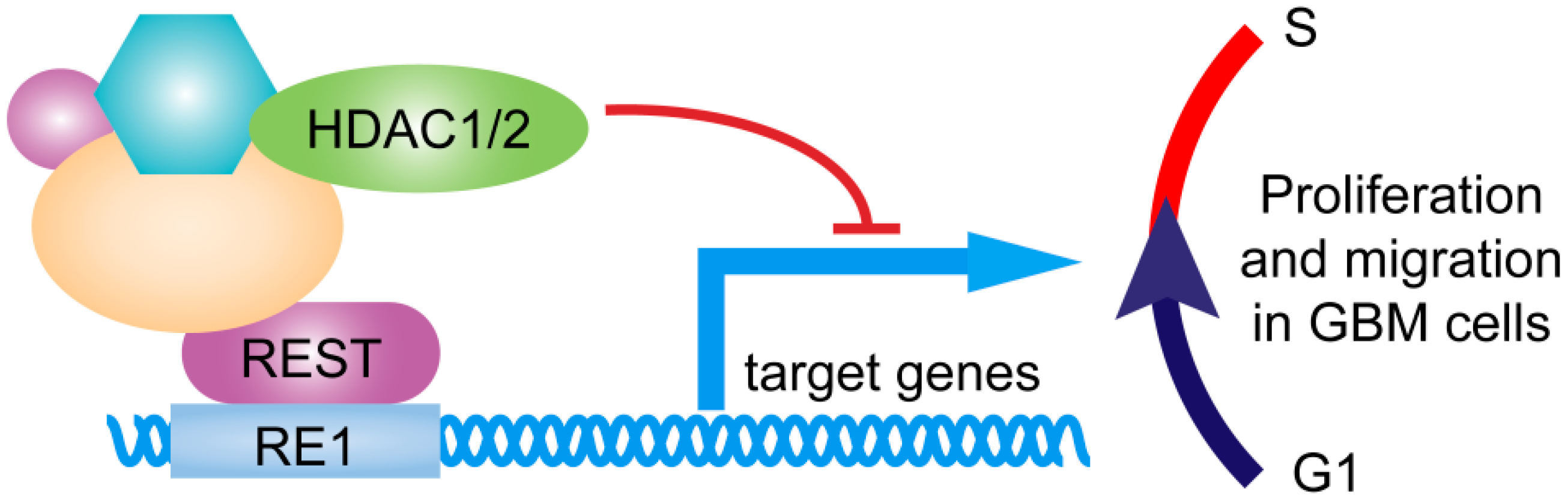 REST was a key regulator of GBM cells proliferation and migration. REST binds to RE1 motif and recruits cofactors to repress downstream genes, triggering cell cycle G1–S transition to maintain proliferation and migration in GBM cells.