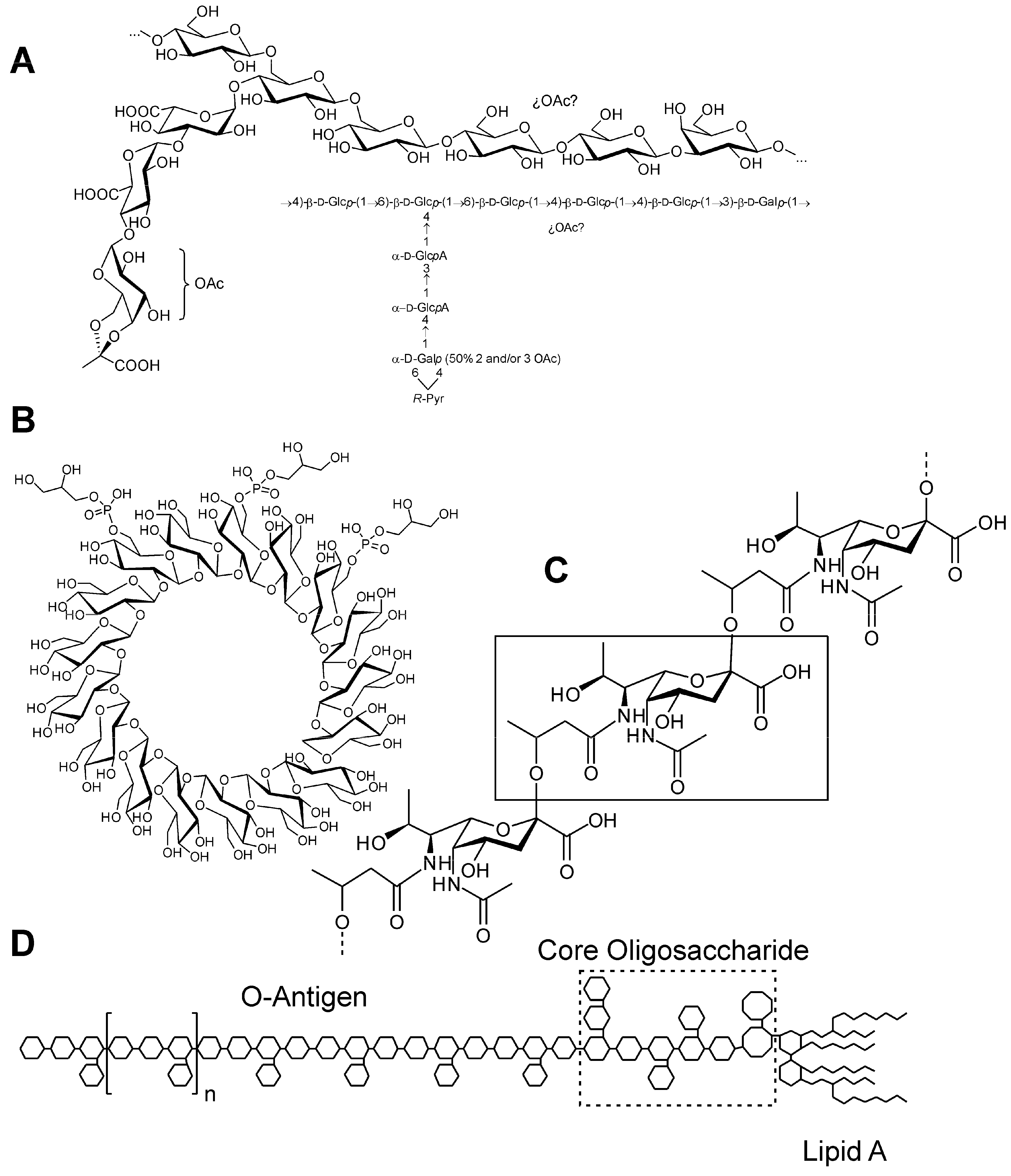 Structure of different Sinorhizobium fredii HH103 surface polysaccharides whose symbiotic relevance has been studied: (A) exopolysaccharide (EPS); (B) cyclic glucans (CG); (C) K-antigen capsular polysaccharide (KPS); and (D) lipopolysaccharide (LPS). ¿OAc?: O-acetyl group of unknown location. Lipid A: LPS moiety anchored to the bacterial external membrane.