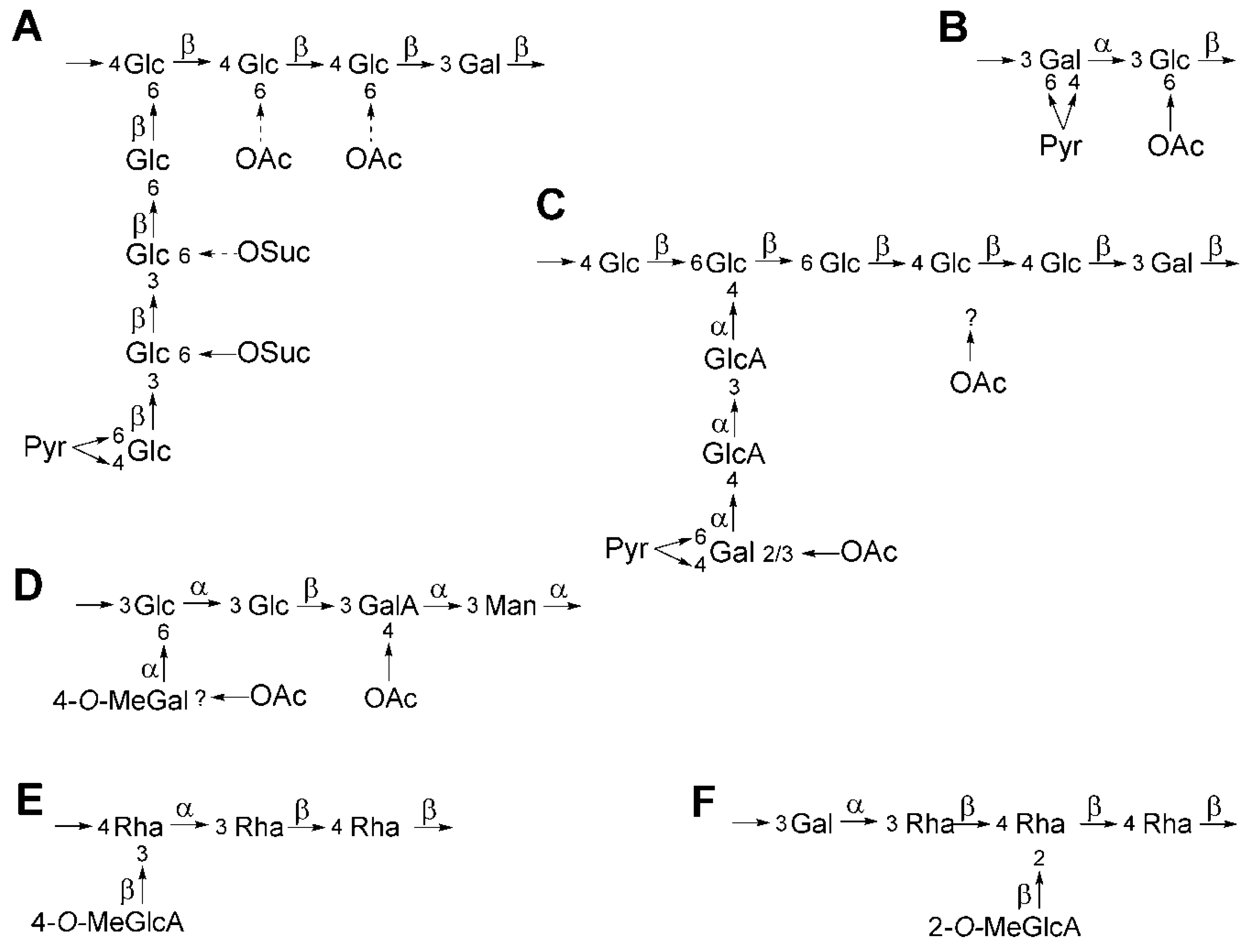 Structure of the EPS (and NPS) produced by different sino- and bradyrhizobia. Sinorhizobium meliloti 1021 EPS I (A) and II (B); Sinorhizobium fredii HH103 and NGR234 EPS (C); Bradyrhizobium japonicum USDA110 EPS (D); Bradyrhizobium elkanii USDA61 EPS/NPS (E); and B. japonicum USDA110 NPS (F). Dashed arrows indicate partial substitutions. α and β: α- and β-glycosidic linkages. ?: the position of the O-acetyl group is unknown.