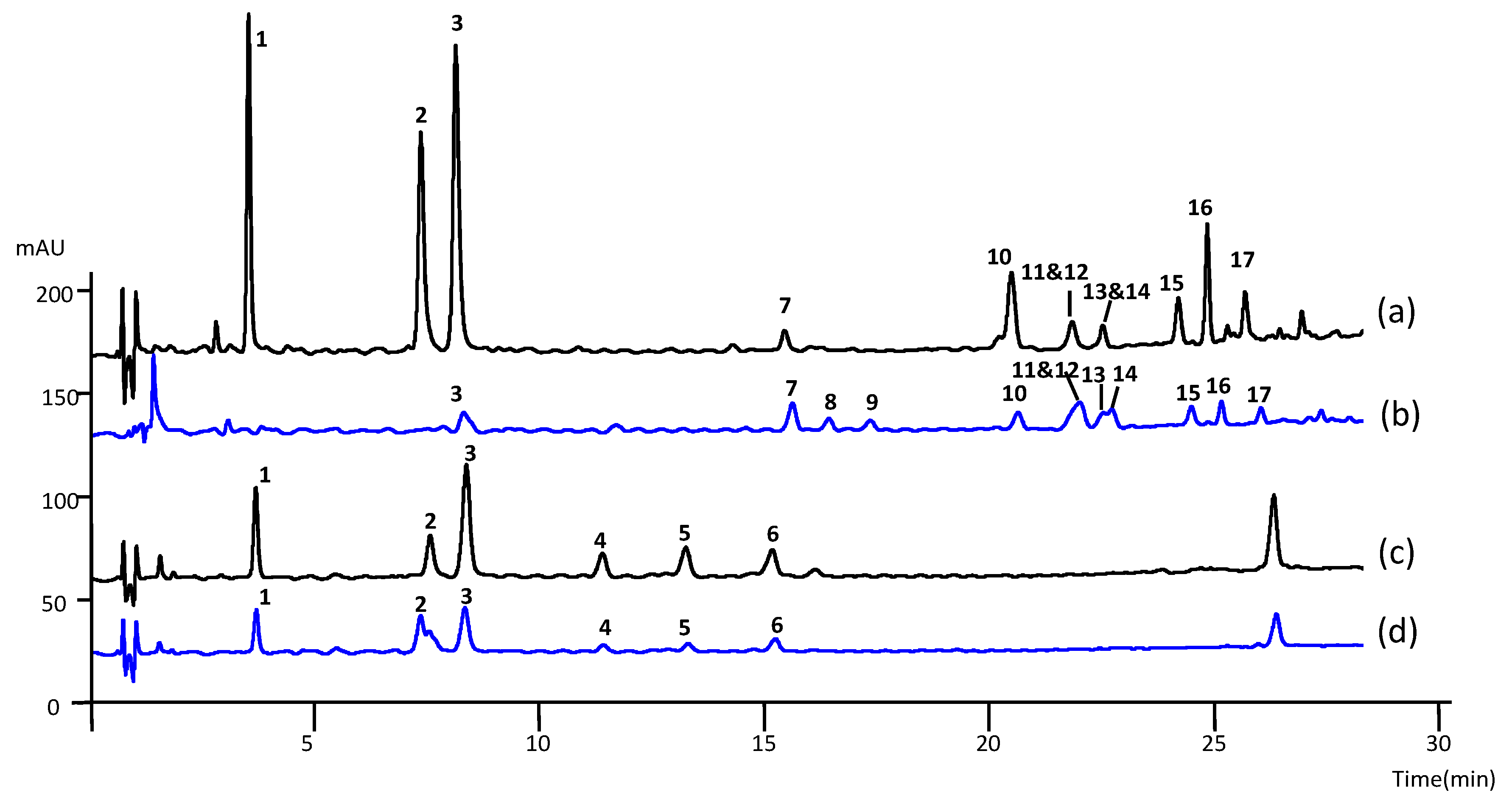 Representative chromatograms of (a) leaflet extracts of Oenocarpus bataua; (b) leaflet extracts of Oenocarpus bacaba; (c) root extracts of Oenocarpus bataua; (d) root extracts of Oenocarpus bacaba at λ = 320 nm; Kinetex PFP column, (100 × 4.6) mm, 2.6 µm. (1) 3-CQA, (2) 4-CQA, (3) 5 CQA, (4) 4-CSA, (5) 5-CSA, (6) CSA, (7) 6,8-di-C-hexosyl apigenin, (8,9) 6,8-di-C-hexosyl apigenin sulfate, (10,14,15), 6-C-hexosyl-8-C-pentosyl apigenin isomers, (12,16) 6-C-pentosyl-8-C-hexosyl apigenin isomer, (11) 8-C-glucosyl luteolin, (13) 6-C-glucosyl luteolin, (17) 6-C-glucosyl apigenin.