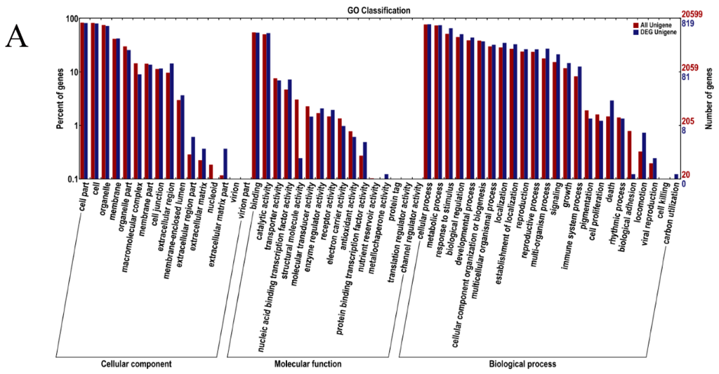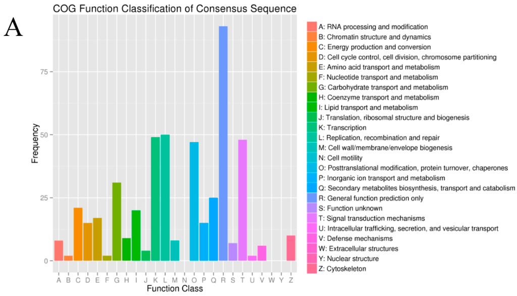 The unigenes were aligned with the NCBI’s nucleotide (nt) databases and non-redundant (nr) protein, the Kyoto Encyclopedia of Genes and Genomes (KEGG) pathway database, the Swiss-Prot protein database, and the Cluster of Orthologous Groups (COG) database. The Blast2GO program was used to assign GO terms [36]. The BLAST [37] program was used to performed COG and KEGG pathway annotation. The above searches were performed with a cut-off e-value of 10−5. The unigenes were aligned to the COG and KEGG databases to predict and classify the possible functions and metabolic pathways of the unigenes. For differential gene expression analysis, Differentially expressed genes were identified using DESeq software [38,39] in each comparison, and the results were analyzed as described previously [1].