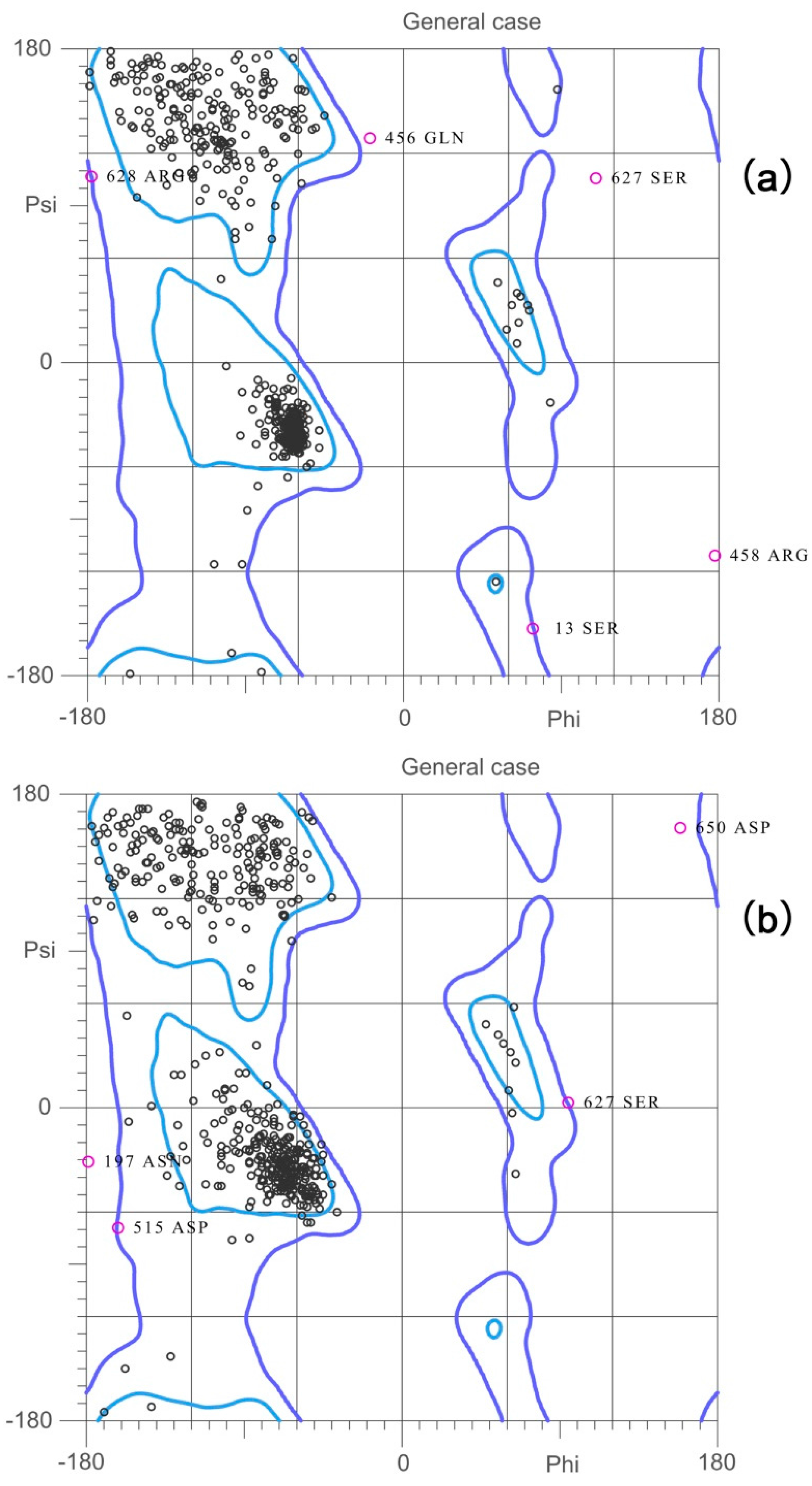 Ramachandran plots of (a) initial 3D structure and (b) final 3D structure of BaThrRS.