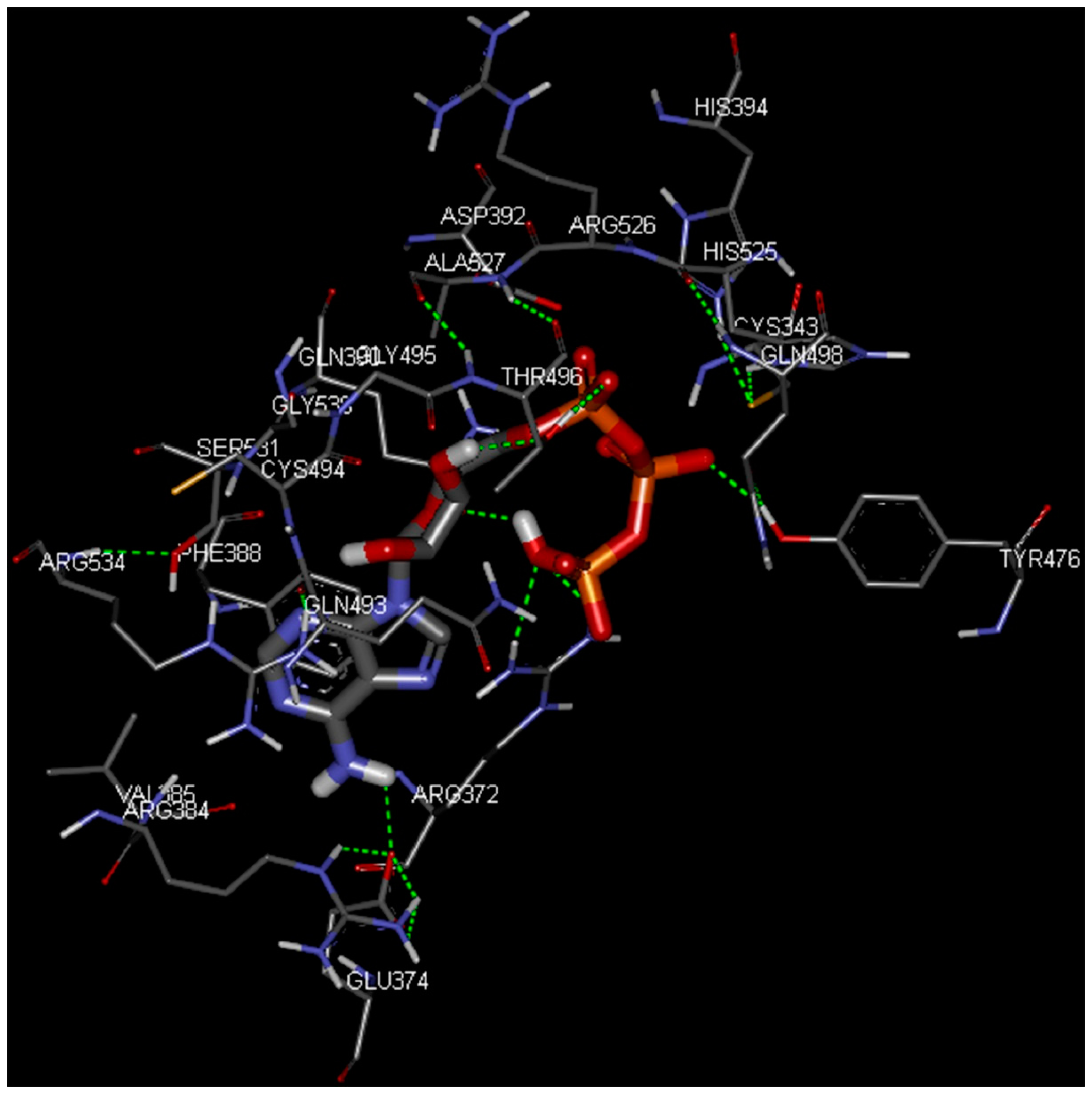 Hydrogen bonds may play important roles in substrate binding. ATP and BaThrRS form eight hydrogen bonds, as seen in Figure 3. Arg372 forms three hydrogen bonds; Thr496 forms two; and Glu374, Tyr476, and Gln390 form one each. Phe388 engages in a π–π stacking interaction with ATP, and Arg534 forms a cation–π interaction. Therefore, Arg372, Thr496, Glu374, Tyr476, Gln390, Phe388, and Arg534 may be more important residues for ATP binding. The ATP is surrounded by Cys343, Arg372, Glu374, Arg384, Val385, Phe388, Gln390, Asp392, His394, Tyr476, Gln493, Cys494, Gly495, Thr496, Gln498, His525, Arg526, Ala527, Gly530, Ser531, and Arg534, most of which are consistent with predictions based on the sequence alignment of BaThrRS and EThrRS. These findings indicate that docking with AutoDock Vina may be used to predict the binding site and binding mode of ATP in BaThrRS. Hence, we used AutoDock Vina for further virtual screening of BaThrRS inhibitors. In selecting hits from the screen, we required that the scores of available novel inhibitors be lower than that of borrelidin (−9.7 kcal/mol).