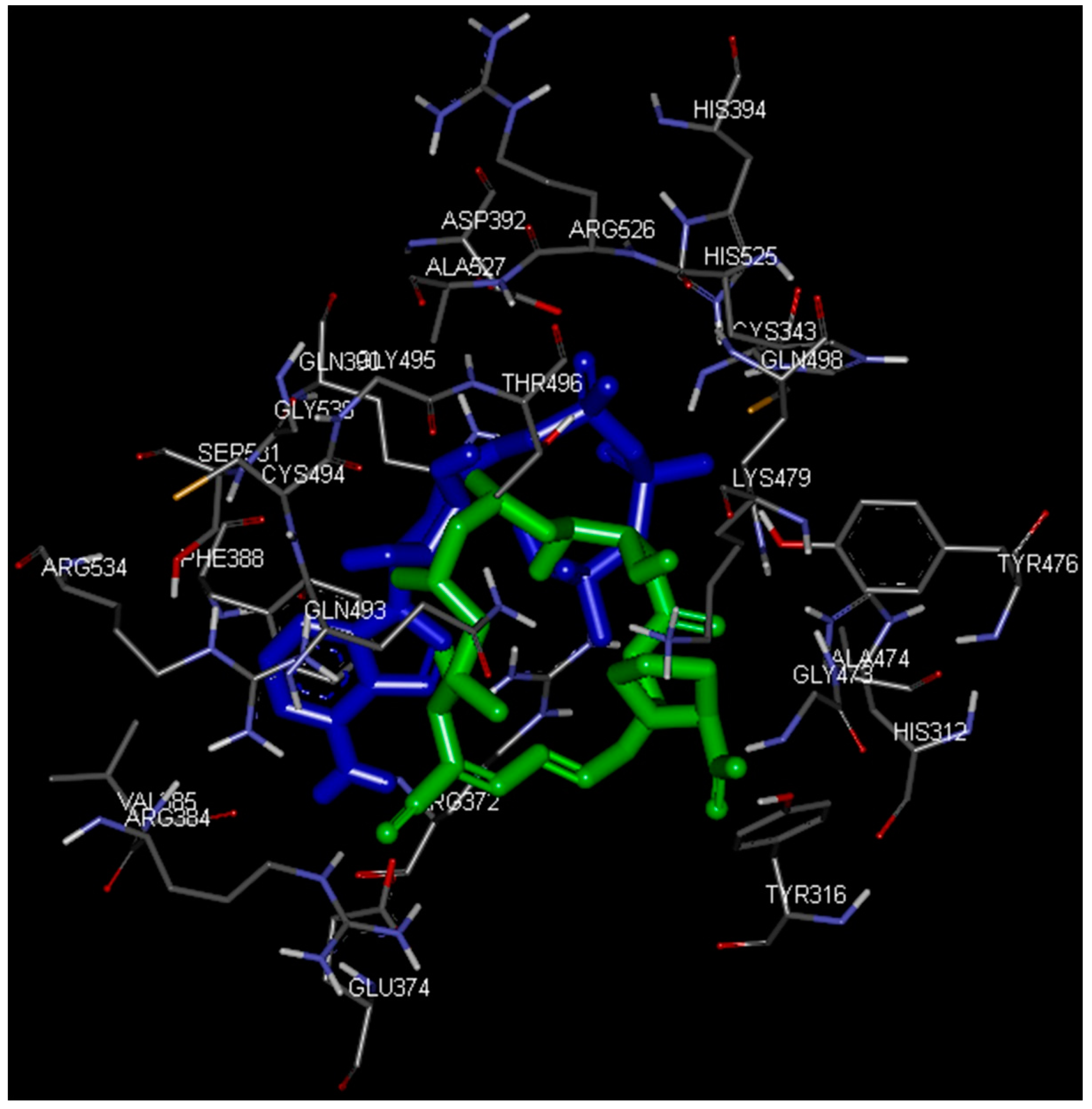Figure 3 and Figure 4 depict the docking of ATP and borrelidin, respectively, to BaThrRS. As shown in Figure 5, ATP (blue) is in the active site pocket, whereas borrelidin (green) is located near the ATP, also in accordance with a previous report [48].