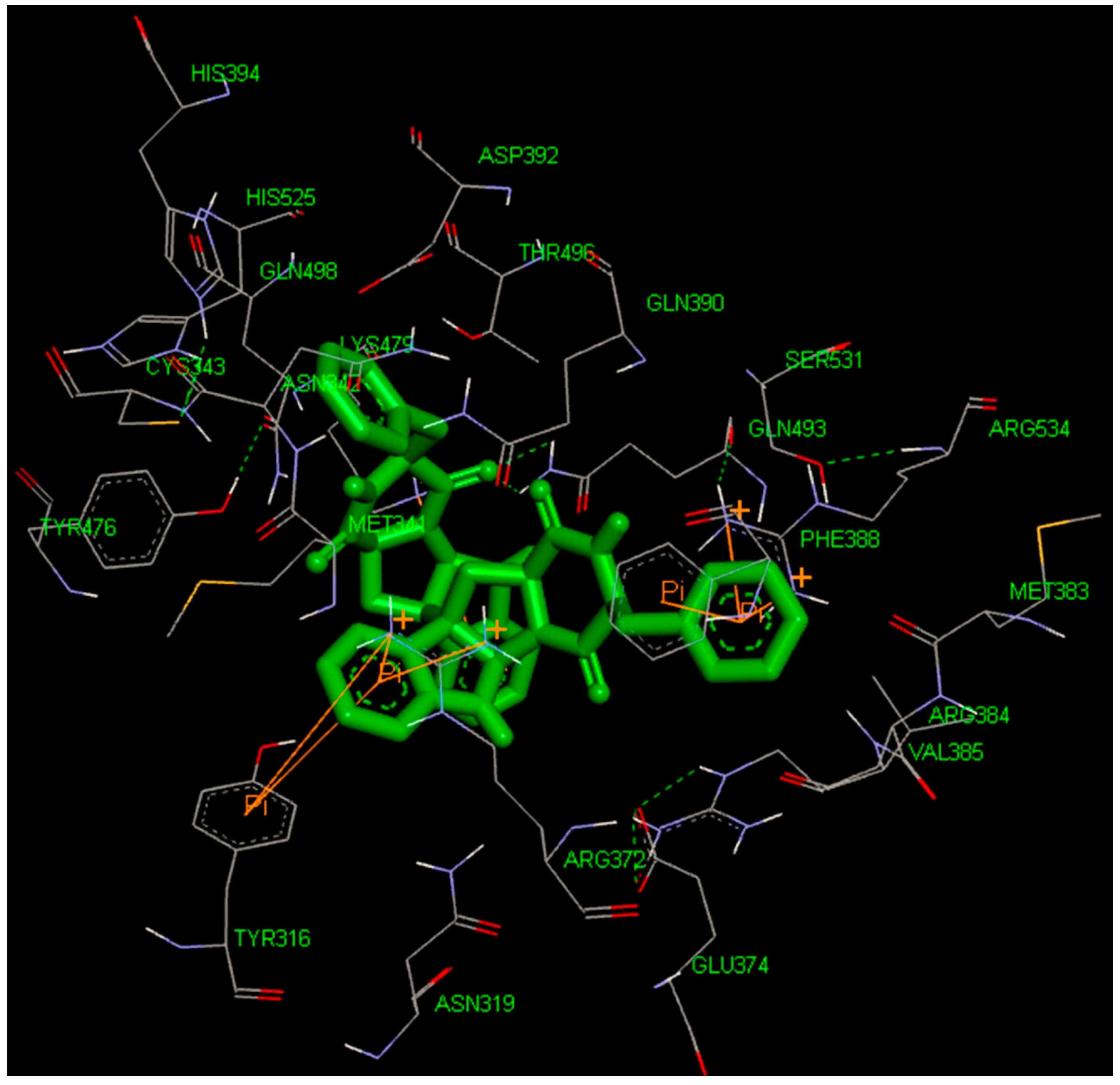 To identify new and potent inhibitors against BaThrRS, we performed docking-based virtual screening on the active site of BaThrRS. The ZINC Natural Products Database (NPD) [49], which includes 11,247 compounds, was used for virtual screening using AutoDock Vina. The screen yielded 99 candidate compounds whose scores were not greater than −11 kcal/mol. The top hits, with scores lower than −12 kcal/mol, are listed in Table 3. It is clear from these results that the screened compounds have stronger interactions and better docking scores than the selective inhibitor borrelidin (−9.7 kcal/mol). We docked the best inhibitor, ZINC27215482 (−12.6 kcal/mol) to BaThrRS and further analyzed its interactions with key amino acid residues. Figure 6 shows the binding mode of ZINC27215482 in BaThrRS. Gln493 forms two hydrogen bonds with the inhibitor, Tyr316 and Phe388 engage in π–π interactions, and Arg534 forms two cation–π interactions. Because cation–π interactions can also contribute significantly to intermolecular contacts and interactions with ligands, it has been proposed that they should be considered alongside more conventional hydrogen bonds, salt bridges, and hydrophobic effects in any analysis of protein structure [50]. As discussed before, the cation–π interaction stabilizes the inhibitor–enzyme complex. As shown in Figure 6, ZINC27215482 was surrounded by Tyr316, Asn319, Met341, Asn342, Cys343, Arg372, Glu374, Met383, Arg384, Val385, Phe388, Gln390, Asp392, His394, Tyr476, Lys479, Gln493, Thr496, Gln498, His525, Ser531, and Arg534. These results serve as a guide for identifying the key residues around the best inhibitor and the interactions between BaThrRS and the best inhibitor, which could be used to develop novel drugs against bovine brucellosis.