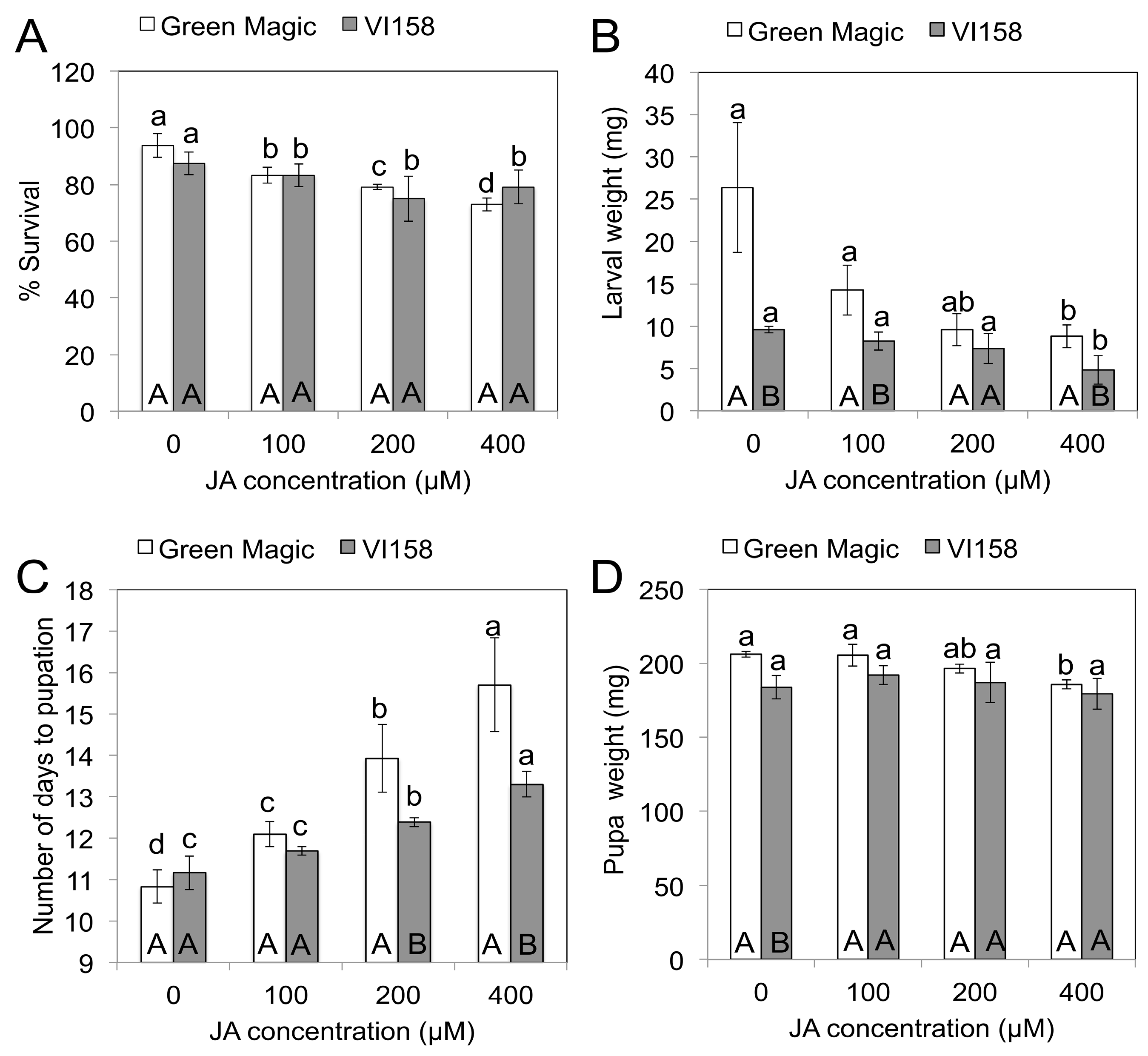 The effect of jasmonate on % survival (A); larval weight (B); number of days to pupation (C); and pupal weight (D) of cabbage looper (Trichoplusia ni) after 5 days feeding on two different broccoli cultivars. Different lower case letters above error bar indicate significant differences between treatments within a cultivar, while upper case letters inside bar indicate differences between cultivars within treatments as determined by Fisher’s LSD test at p = 0.05. The results are presented as means ± SD (n = 3).