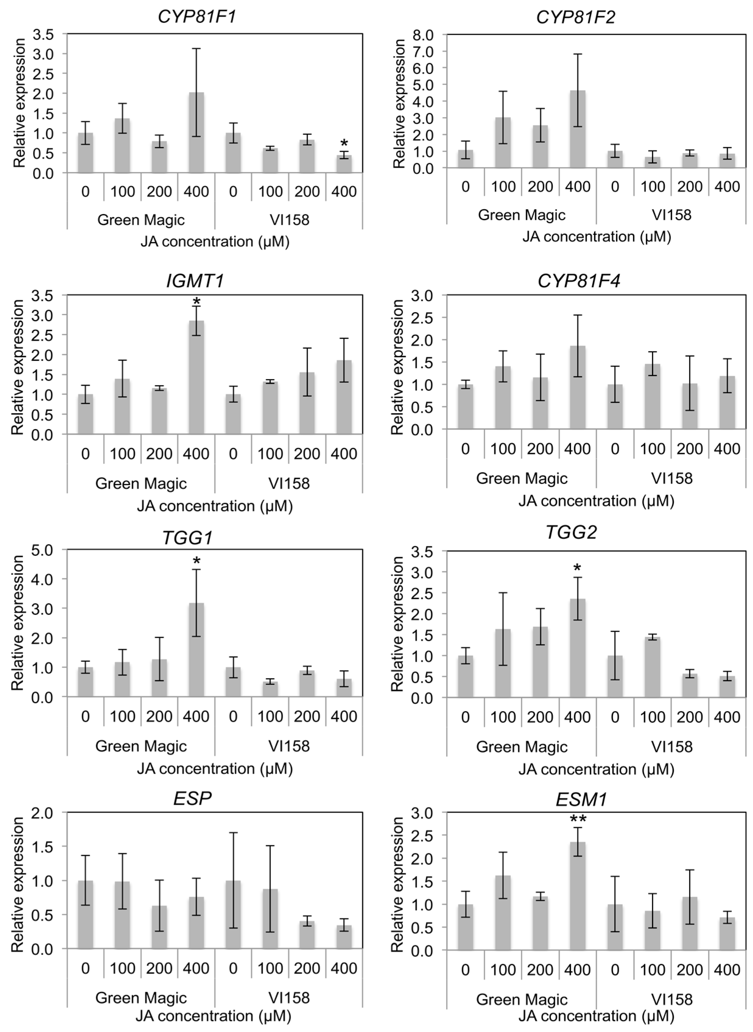 In indole GS side chain modification-related gene expression, CYP81F1, CYP81F2, and CYP81F4 were not significantly changed after JA treatment in either cultivar (Figure 4 and Figure S2). However, some trends were observable in the transcription of these genes that differed between the two cultivars. In general, Green Magic showed an increase in transcription of CYP81F family genes with increasing JA concentration, while no increase, or even a slight decrease, was observed in VI-158 (Figure 4 and Figure S2). The gene expression of IGMT1, which is responsible for O-methyltransferase activity needed to create neoglucobrassicin and 4-methoxy glucobrassicin, was significantly increased only in the 400 µM JA treated Green Magic broccoli plants (Figure 4 and Figure S2). The gene expression of myrosinase enzymes TGG1 and TGG2 was also only increased in 400 µM JA-treated Green Magic broccoli tissue. The gene expression of ESM1 was significantly increased in 400 µM JA-treated Green Magic broccoli seedlings although the gene expression of ESP was not significantly changed by JA treatment. These increases in TGG1, TGG2, and ESM1 transcription can help to explain the stark increase in MI3C concentrations in Green Magic. It is known that ESM1 antagonizes ESP activity and influences GS hydrolysis towards isothiocyanates for a number of GSs. In the case of neoglucobrassicin hydrolysis, the isothiocyanate formed is highly unstable and is known to rearrange into MI3C and NeoASG, among other products [39]. Additionally, increasing the abundance of myrosinase may lead to the formation of more isothiocyanates, as this is the major hydrolysis product produced in the absence of specifier proteins and with limiting Fe2+ [40,41].
