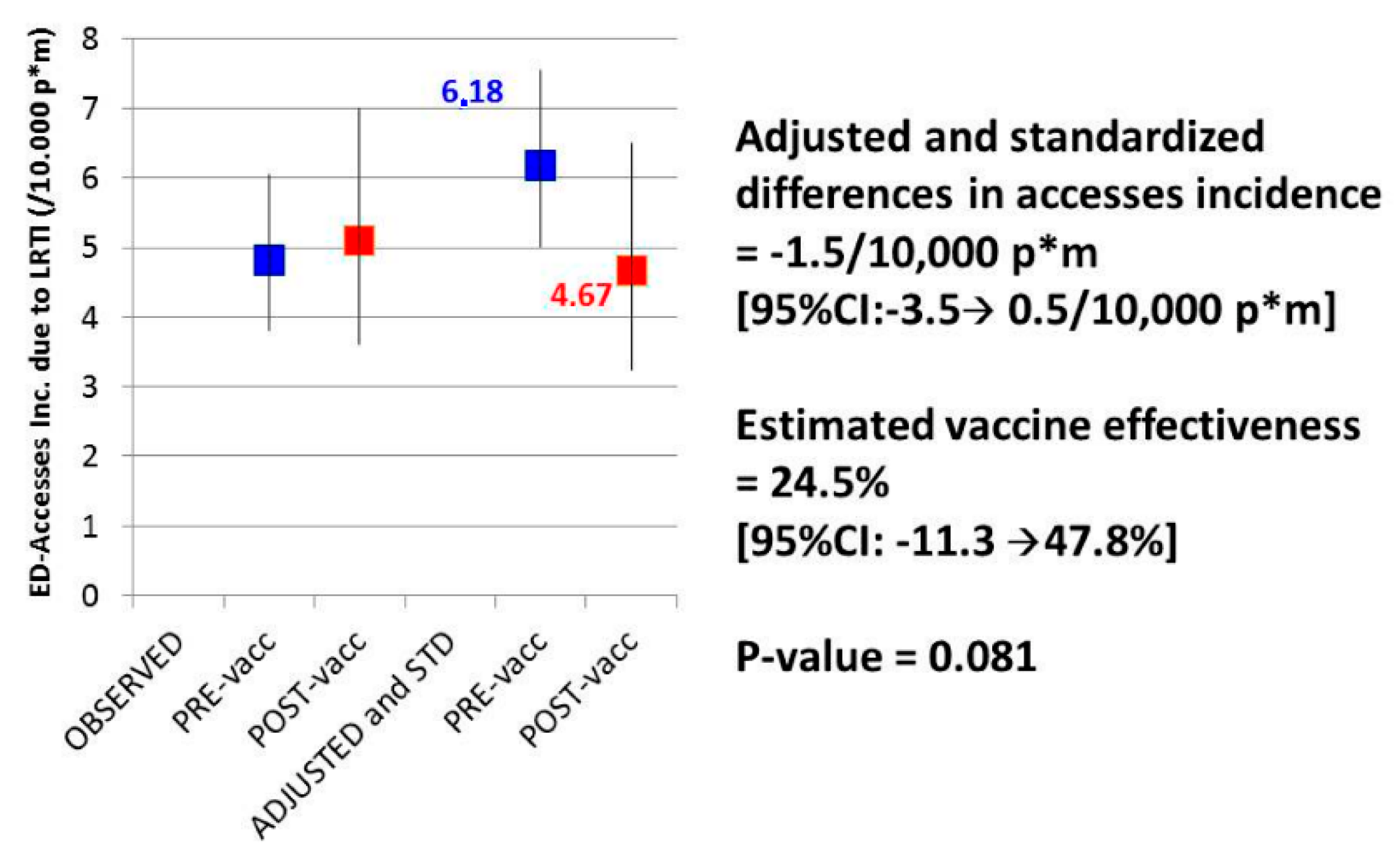 To the best of our knowledge, the only Italian published experience reporting an estimate of on-field effectiveness of a PCV13 immunization program implementation in adults is that of Orsi et al. [36]. Our research group reported the preliminary results of a crossover evaluation of the effect of PCV13 introduction in adults aged ≥70 years in Liguria, conducted in Genoa in the period between September 2010 and August 2014 and is still ongoing. Vaccine effectiveness was estimated in terms of incidence of ED-access for LRTI obtained by the above cited syndrome surveillance system, measured before and after PCV13 vaccination in a population cohort of more than 30,000 individuals aged between 70 and 75 years at the beginning of the study and resident in the metropolitan area of Genoa. Updated preliminary estimates, based on an observation period of 155,274 and 74,419 person-months, respectively before and after pneumococcal vaccination, of the first 3782 vaccinated subjects (median age at the time of vaccination 74.6 years, 10°–90° perc. 70.6–76.3 years, median time of observation before and after vaccination 41.8 and 18.9 months, respectively), showed a reduction in the incidence of ED accesses for LRTI in the vaccinated population, compared to those not vaccinated. The preventive fraction, adjusted for ageing effects and standardized for the different incidences observed during the study period, was estimated to be 24.5% (95% CI: −11.3%–47.8%), with a decrease in ED access incidence of 1.5/10,000 person-months (95% CI: −3.5–0.5/10,000 person-months) (Figure 1). The surveillance period ended on August 2015 and definitive results will be available in the second half of 2016, when the expected vaccinated cohort will add to about 6000 subjects. This population-based approach showed the effectiveness of the current recommendations of the Liguria region for the prevention of pneumococcal disease in adults and high-risk groups, and the beneficial impact of PCV13 vaccination in adults in “real world” clinical and epidemiological settings.