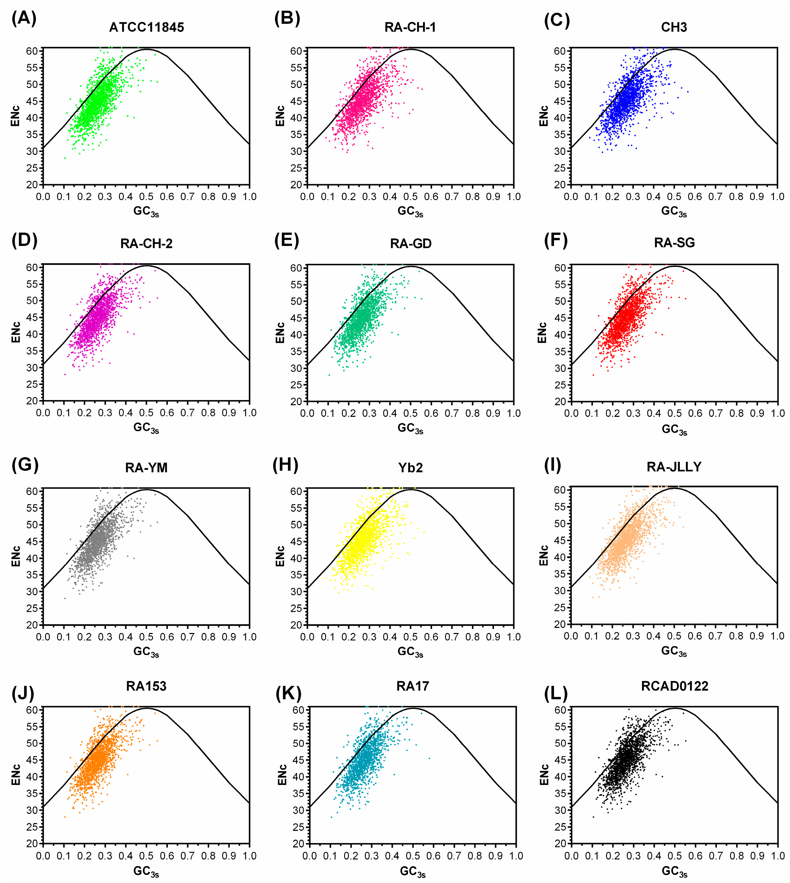 The ENc vs. GC3s plots of RA genomes. (A) ATTCC11845; (B) RA-CH-1; (C) CH3; (D) RA-CH-2; (E) RA-GD; (F) RA-SG; (G) RA-YM; (H) Yb2; (I) RA-JLLY; (J) RA153; (K) RA17; and (L) RCAD0122. The standard curve represents the expected ENc to GC3s. Most RA genes are far away from the standard curve, showing that their codon usage pattern might be affected by other factors besides nucleotide composition. Some genes with the ENc score of 61 display no bias and use all the 61 sense codons.