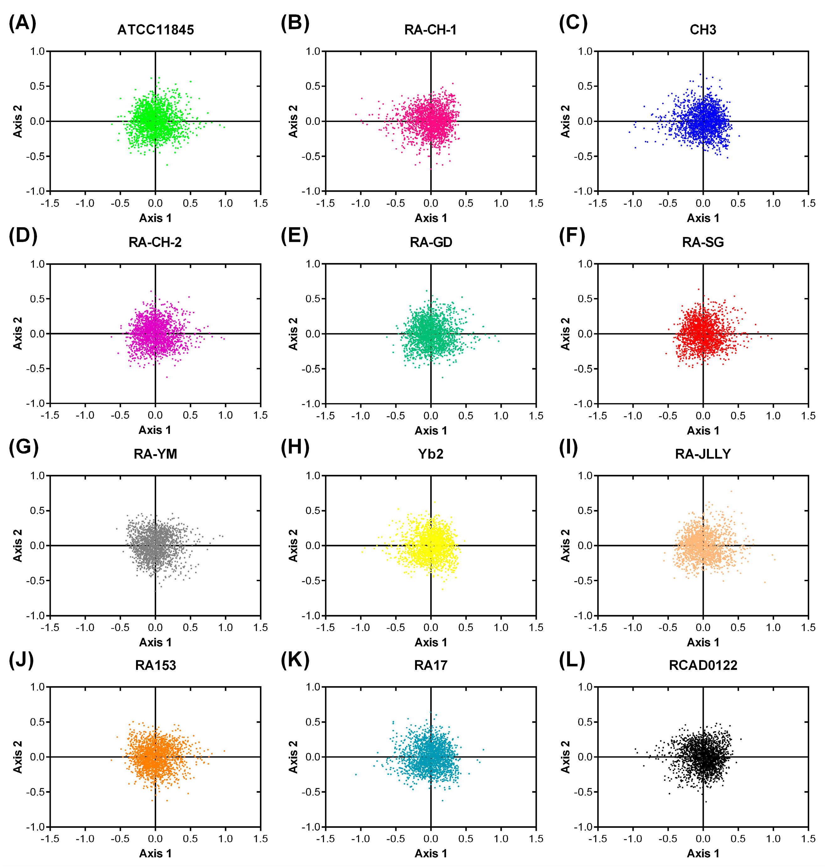 The correspondence analysis (COA) of the genes in RA genomes. (A) ATTCC11845; (B) RA-CH-1; (C) CH3; (D) RA-CH-2; (E) RA-GD; (F) RA-SG; (G) RA-YM; (H) Yb2; (I) RA-JLLY; (J) RA153; (K) RA17; and (L) RCAD0122. Each point represents a gene corresponding to the coordinates of the first and second axes of variation generated from the correspondence analysis.