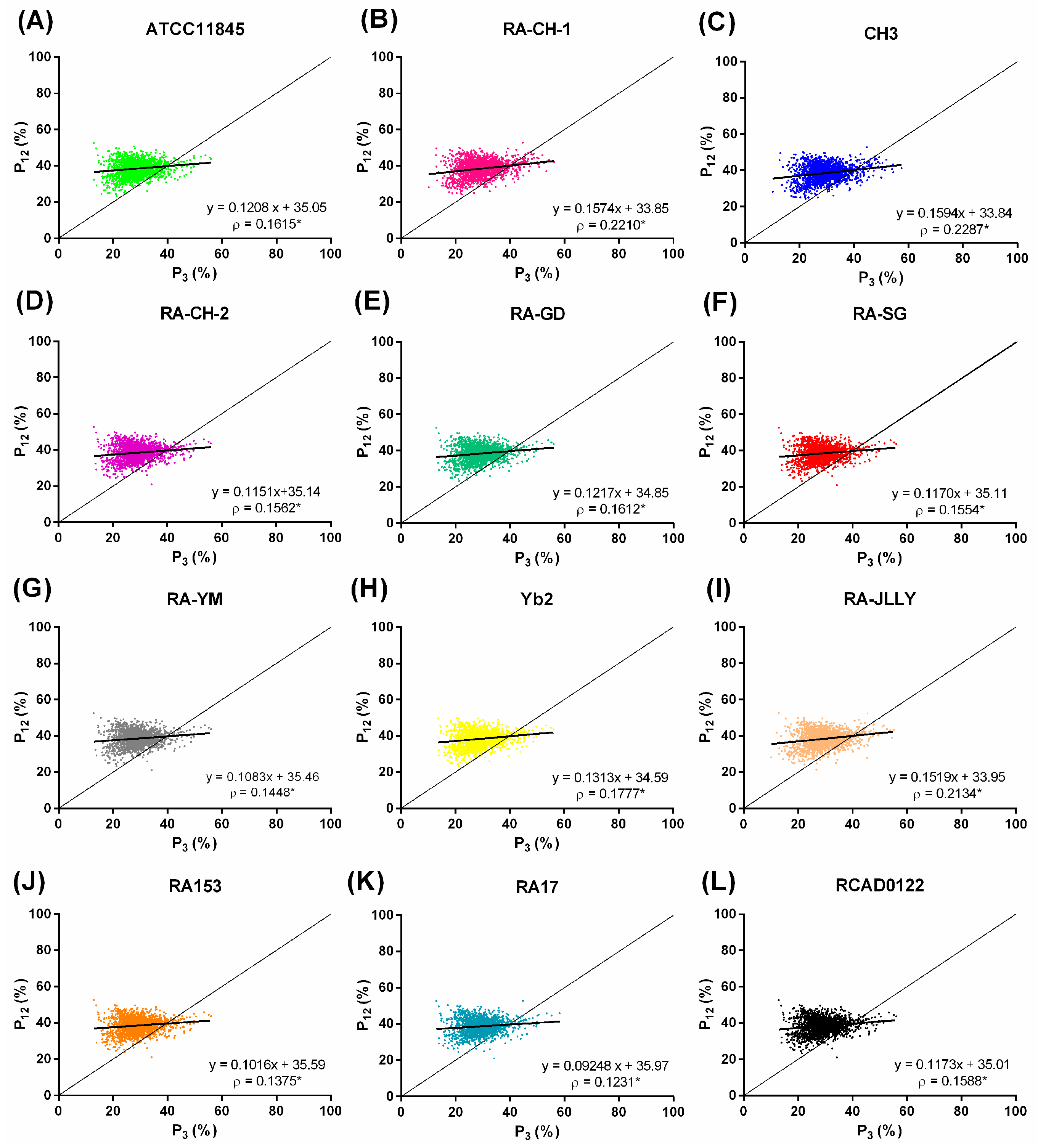 Neutrality plots of RA genomes. (A) ATTCC11845; (B) RA-CH-1; (C) CH3; (D) RA-CH-2; (E) RA-GD; (F) RA-SG; (G) RA-YM; (H) Yb2; (I) RA-JLLY; (J) RA153; (K) RA17; and (L) RCAD0122. Individual genes are plotted based on the mean GC content in the first and second codon position (P12) versus the GC content of the third codon position (P3). Regression lines and Spearman’s rank correlation coefficients (ρ) are shown, with the asterisk (*) denoting p-values < 0.01.