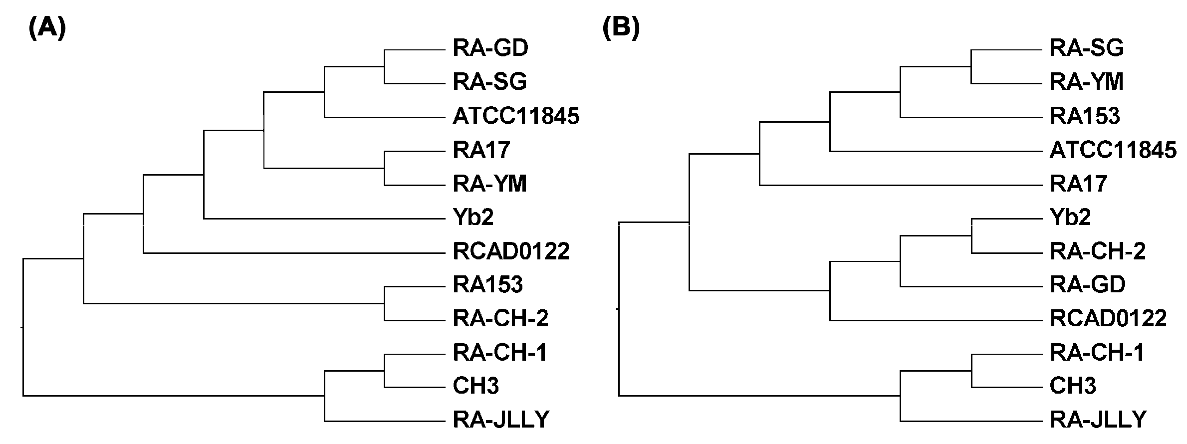 To gain more insight into evolution of the RA, the RSCU values between 12 species were used in hierarchical clustering (Figure 5B). Cluster analysis for RA family yielded five major clusters, similar to dendrogram based on genomic BLAST by neighbor-joining method (Figure 5A). Cluster I is composed of RA-CH-2, RA-GD, Yb2 and RCAD0122, meanwhile RA-CH-2 and Yb2 stay the closest and are isolated almost from the root. Cluster II contains ATCC11845, RA153, RA-SG and RA-YM. RA-SG and RA-YM appear closely related to RA153, but are on different branches compared to ATCC11845. RA17 has a close relationship with cluster II divided into cluster III. RA-CH-1 and CH3, belonging to the serotype 1, are clustered in cluster IV. The highly biased RA-JLLY is clustered alone as a minor cluster of cluster V and close to the branch of RA-CH-1 and CH3.