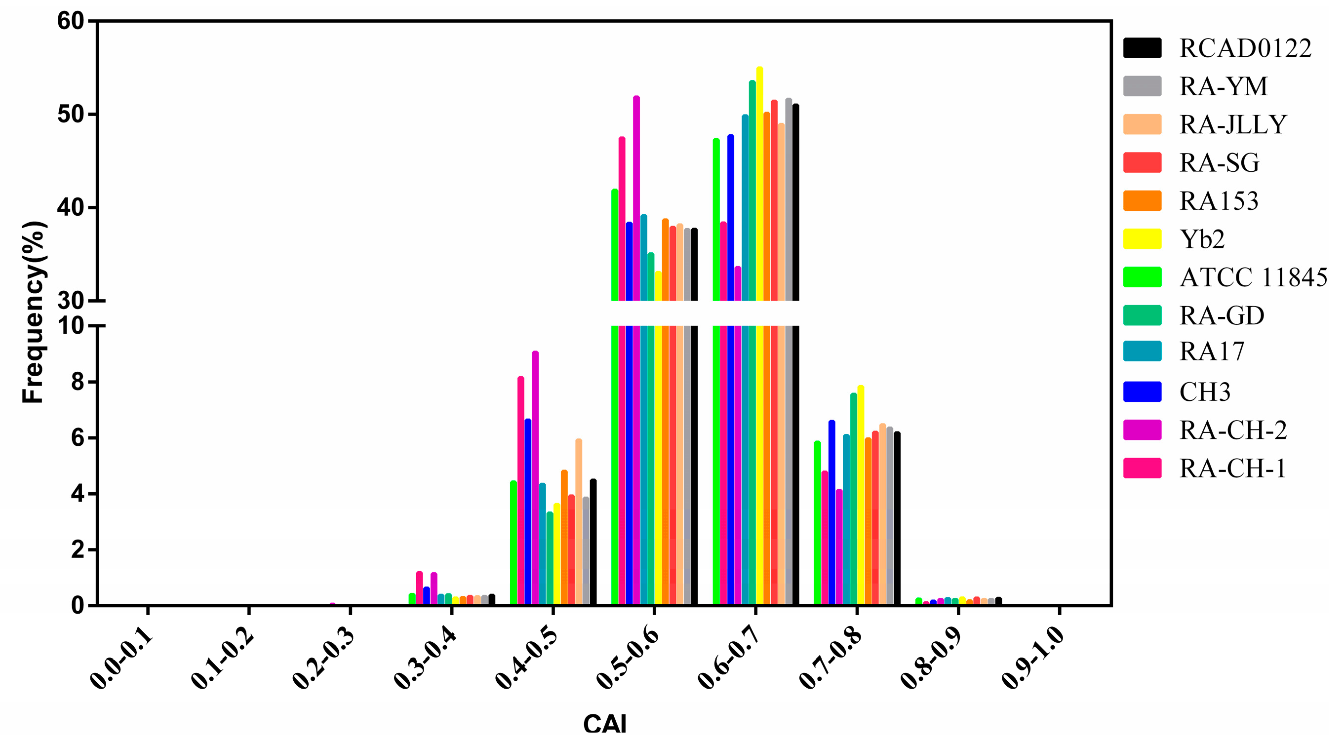 Frequency distribution of codon adaptation index (CAI) values for coding sequence (CDS) in the genomes of RA strains.
