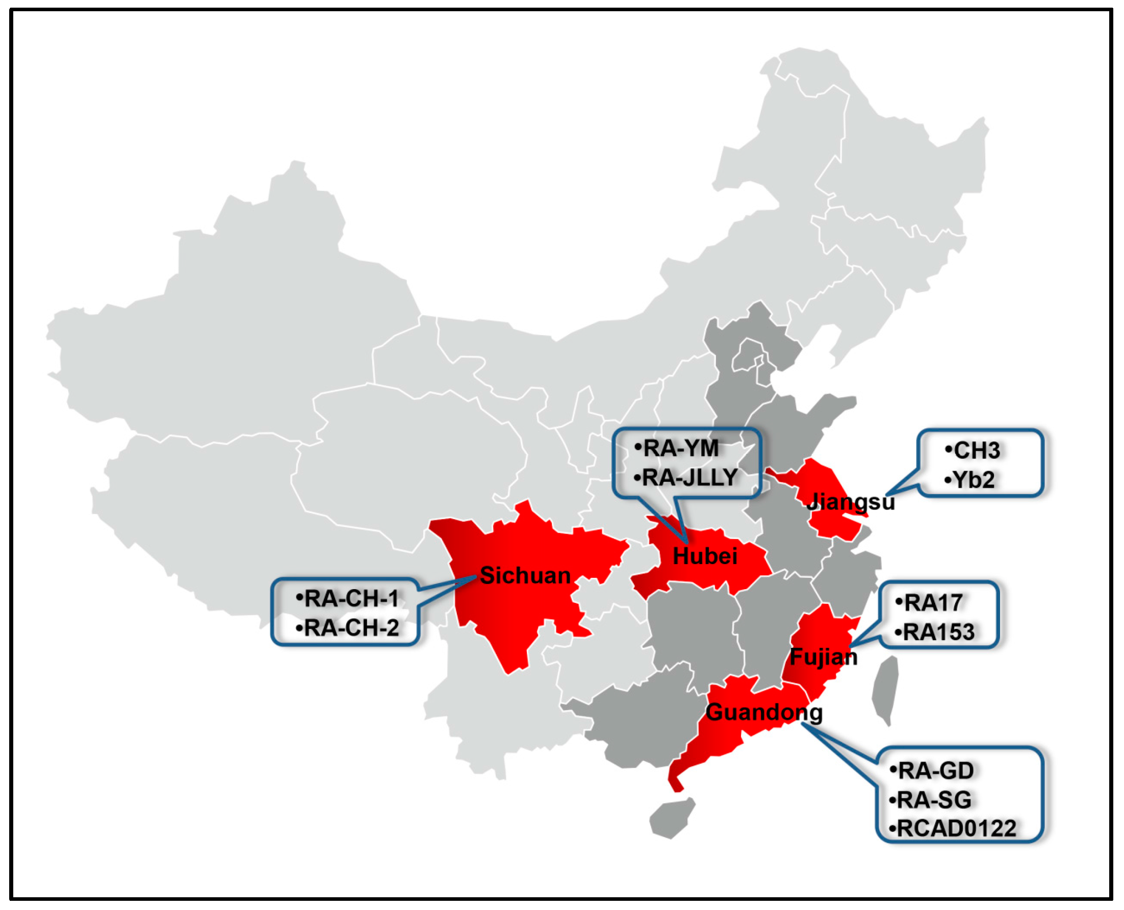 A total of 12 RA genomes were used in this study. The coding sequences (CDS) datasets from the whole genome sequences were obtained from National Center of Biotechnology Information (NCBI). To minimize sampling bias in codon usage calculations only CDS of at least 100 codons in length with correct initiation were used in further analysis. Detailed information about these strains is listed in Table 4, and the distribution of these strains except ATCC11845 in the different provinces of China is shown in Figure 7.