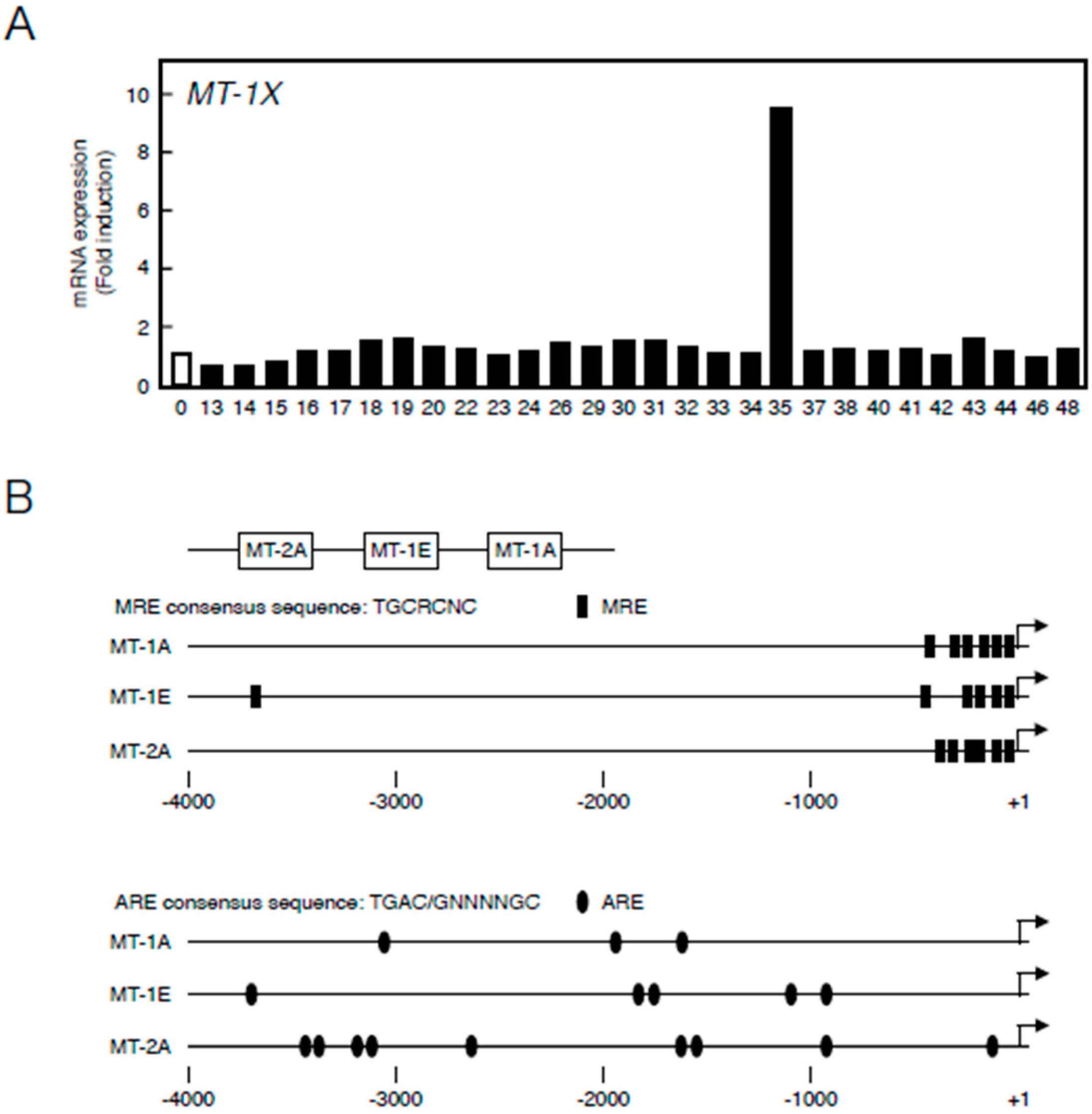 Mechanisms underlying transcriptional induction of MT genes are not completely understood. Metal response element-binding transcription factor-1 (MTF-1) mediates heavy metal signaling and is essentially required for MT gene expression [15]. MTF-1 is activated by zinc and binds the sequences termed metal responsive element (MRE) that exist in the upstream region of the MT gene [16,17]. Additionally, the MT gene includes sequences termed antioxidant response element (ARE) in the promoter region [2,18], which are activated by the transcriptional factor nuclear factor-erythroid 2-related factor 2 (Nrf2) and regulate the expression of antioxidant genes [19]. Although ARE is involved in the transcriptional induction of MT genes by hydrogen peroxide [20], there is little information about the role of ARE in the MT induction. We hypothesize that the MTF-1–MRE and Nrf2–ARE pathways cooperatively regulate transcription of MT.