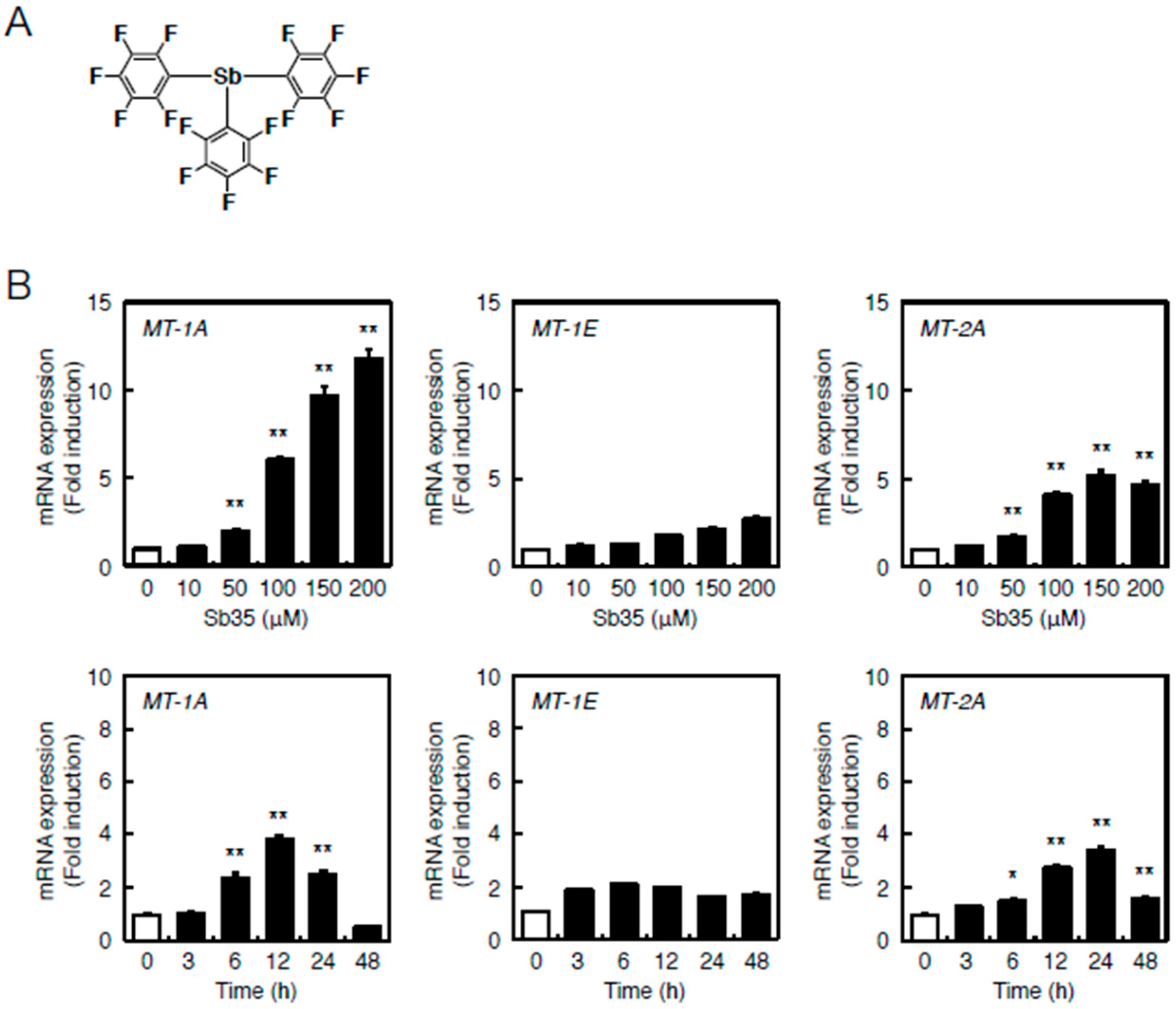 Sb35-induced transcription of endothelial MT-1A, MT-1E, and MT-2A. (A) Structure of Sb35; (B) Sb35-induced transcription of MT. Vascular endothelial cells were incubated with or without 10, 50, 100, 150, or 200 µM Sb35 for 12 h (upper panels) or 100 µM Sb35 for 3, 6, 12, 24, or 48 h (lower panels). MT-1A, MT-1E, and MT-2A mRNA expression was determined by performing real-time RT-PCR. Data are expressed as the mean ± SE of three representative samples, with each sample obtained from three independent experiments. * p < 0.05 and ** p < 0.01 indicate significantly different from the corresponding control.