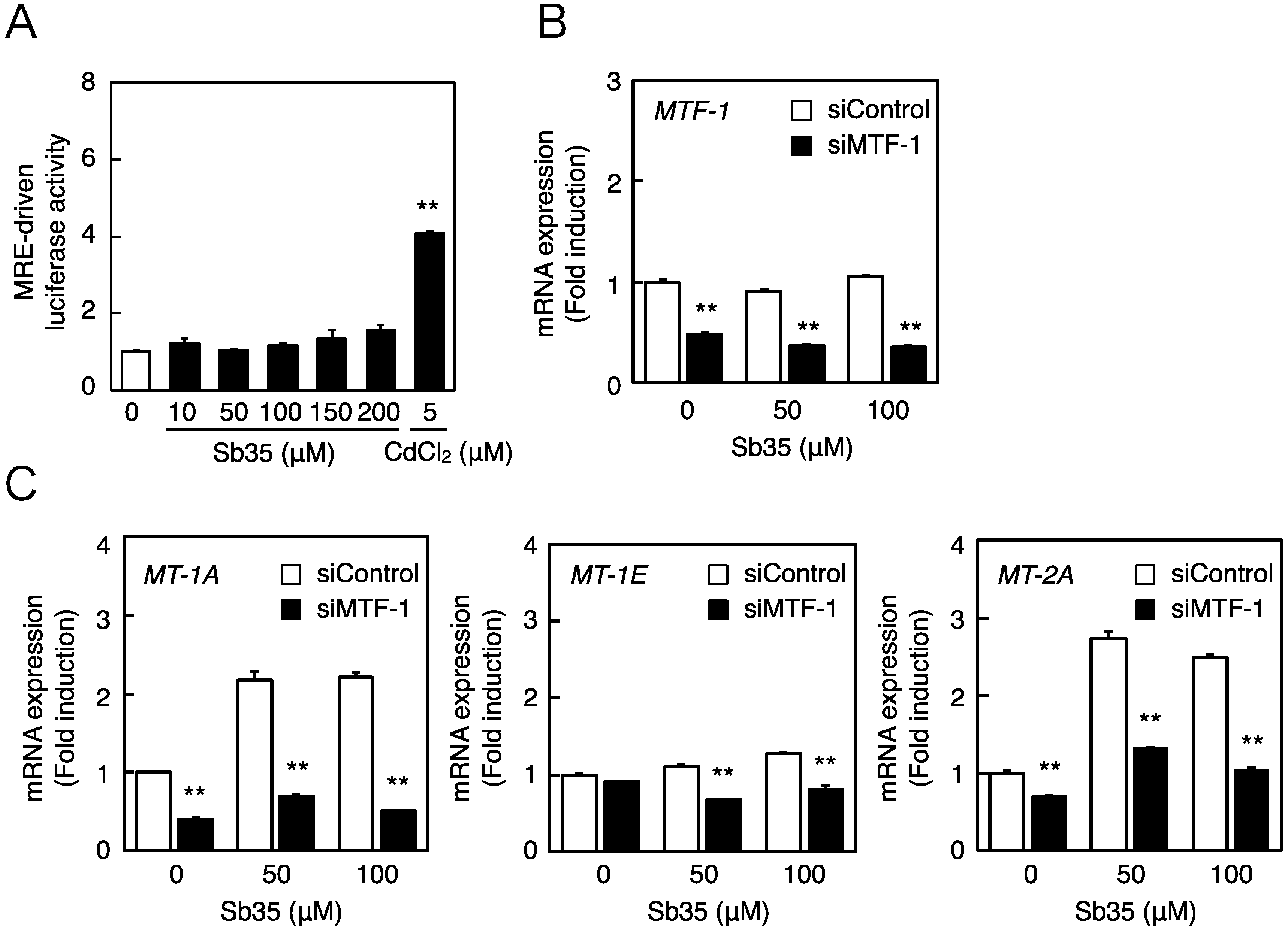 The MTF-1–MRE pathway mediates Sb35-induced transcription of endothelial MT-1A, MT-1E, and MT-2A. (A) MRE-driven transcriptional activity. Vascular endothelial cells transfected with an MRE reporter vector were treated with or without 10, 50, 100, 150, or 200 µM Sb35 or 5 µM cadmium for 12 h, and MRE-driven transcriptional activity was determined by performing the MRE-directed reporter assay; (B) siRNA-mediated MTF-1 knockdown. Vascular endothelial cells transfected with control or MTF-1 siRNA were treated with or without 50 or 100 µM Sb35 for 12 h, and expression of MTF-1 mRNA was determined by performing real-time RT-PCR. Data are expressed as the mean ± SE of three samples. ** p < 0.01 indicates significantly different from the corresponding siControl; (C) Sb35-induced transcription of endothelial MT-1A, MT-1E, and MT-2A after MTF-1 knockdown. Vascular endothelial cells transfected with control or MTF-1 siRNA were treated with or without 50 or 100 µM Sb35 for 12 h. Data are expressed as the mean ± SE of three representative samples, with each sample obtained from three independent experiments. ** p < 0.01 indicates significantly different from the corresponding siControl.
