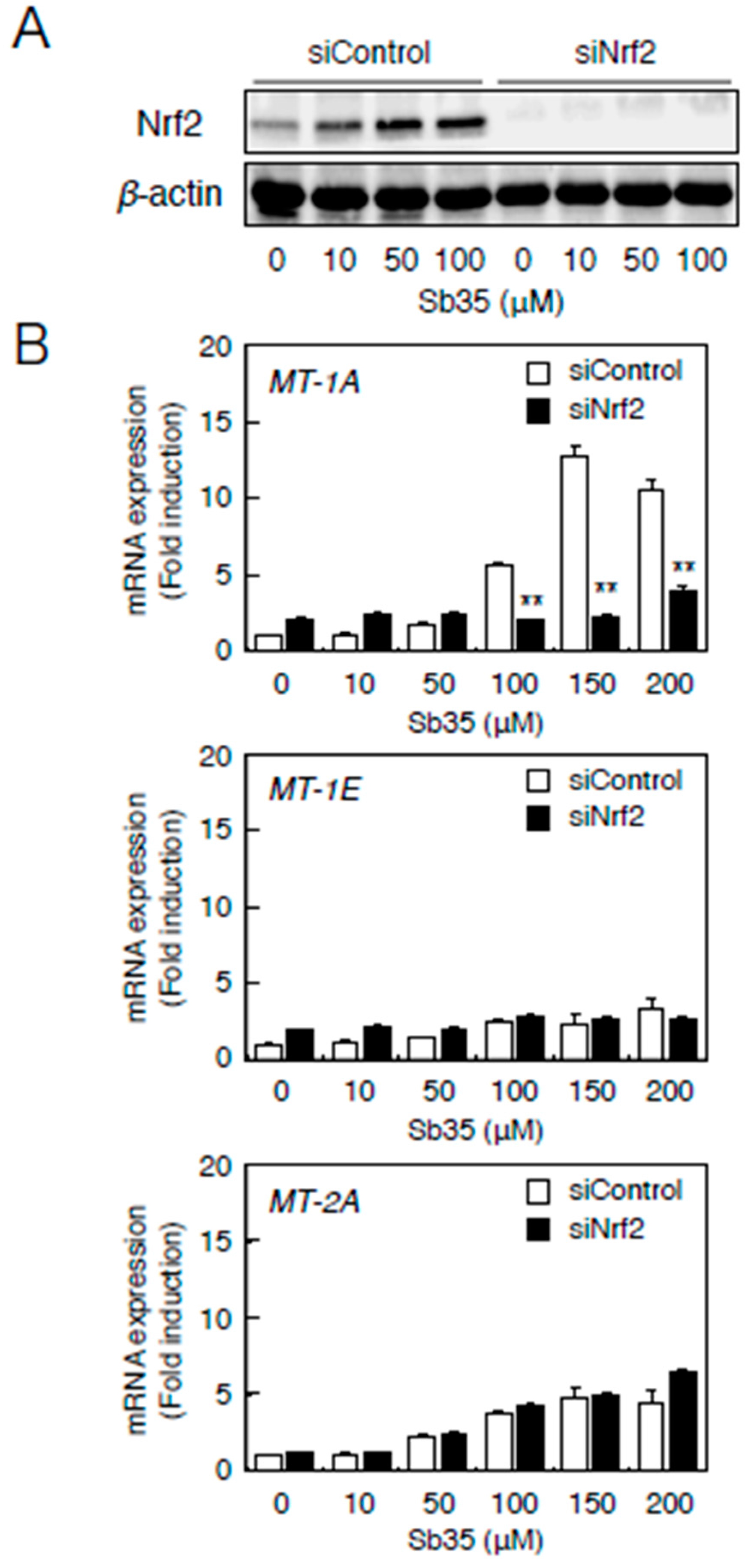 The Nrf2–ARE pathway mediates Sb35-induced transcription of endothelial MT-1A, MT-1E, and MT-2A. (A) Expression of Nrf2. Vascular endothelial cells transfected with control or Nrf2 siRNA were treated with or without 10, 50, or 100 µM Sb35 for 24 h, and expression of Nrf2 was determined by performing Western blotting; (B) Sb35-induced transcription of endothelial MT-1A, MT-1E, and MT-2A after Nrf2 knockdown. Vascular endothelial cells transfected with control or Nrf2 siRNA were treated with or without 10, 50, 100, 150, or 200 µM Sb35 for 12 h. Data are expressed as the mean ± SE of three representative samples, with each sample obtained from three independent experiments. ** p < 0.01 indicates significantly different from the corresponding siControl.