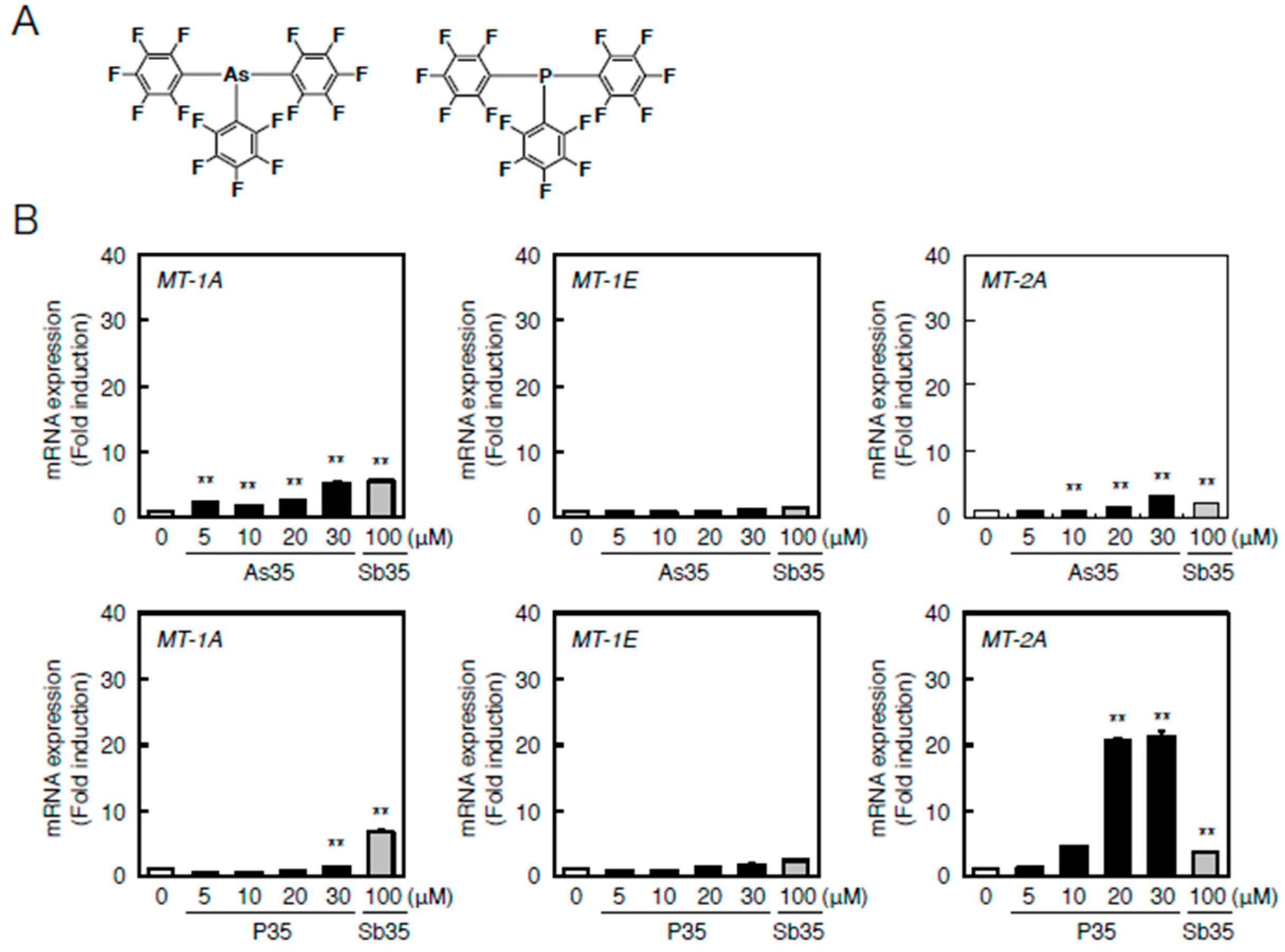 Understanding the role of the antimony atom in Sb35 molecules in endothelial MT induction is important for understanding the bioactivity of Sb35 as a hybrid molecule. In order to increase the understanding of the role of antimony atom, we next investigated the effects of pnictogen analogues—As35 and P35 (Figure 6A)—on the transcriptional induction of MT-1A, MT-1E, and MT-2A in bovine aortic endothelial cells. As35 significantly increased MT-1A and MT-2A expression similarly to Sb35 (Figure 6B, upper panels). The transcriptional induction of MT-1A and MT-1E by P35 was very weak; however, P35 strongly induced transcription of MT-2A (Figure 6B, lower panels).