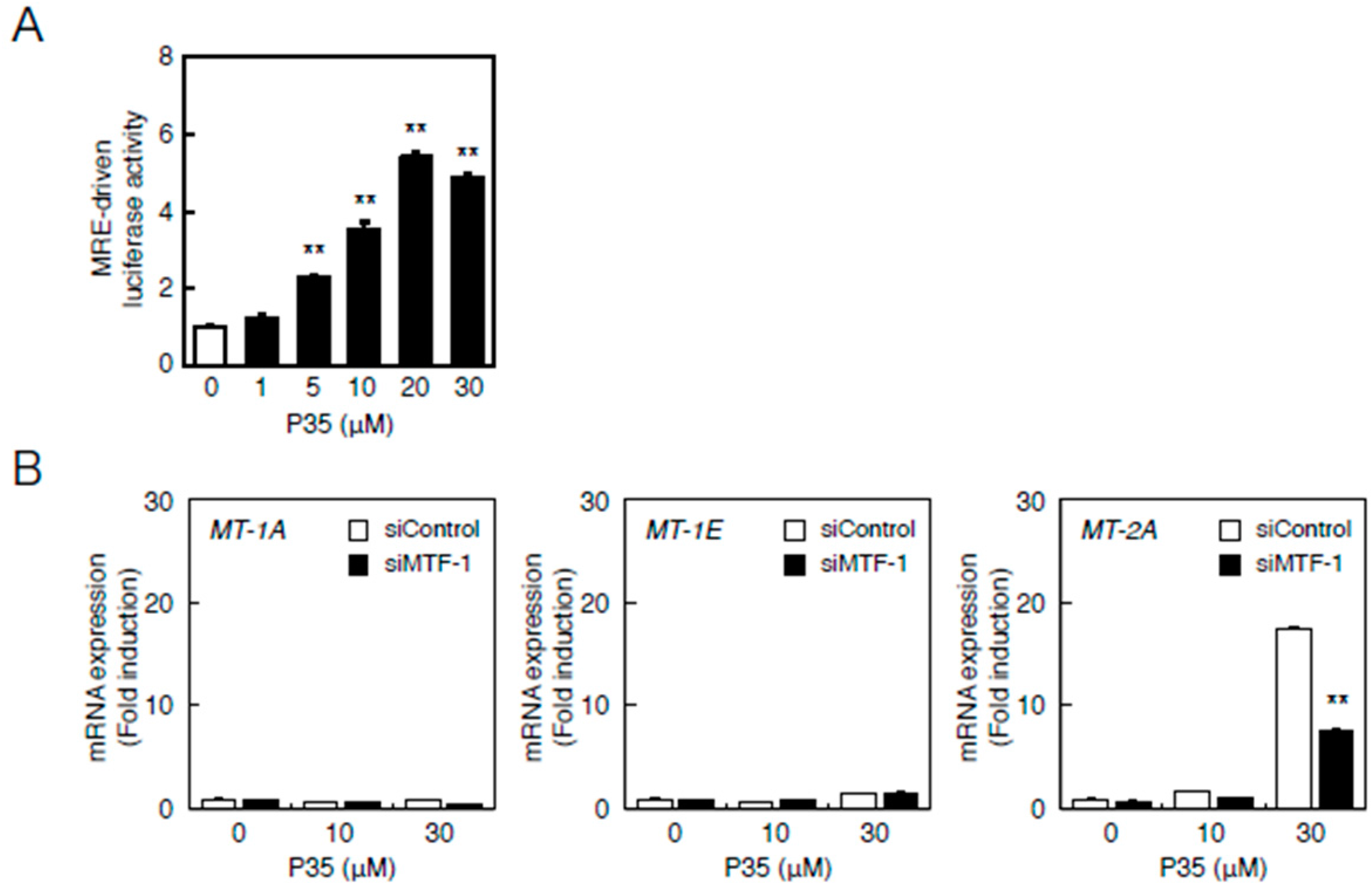 Therefore, we investigated the involvement of the MTF-1–MRE and Nrf2–ARE pathways in the transcriptional induction of MT-2A by P35. P35 significantly increased MRE-driven transcription in a concentration-dependent manner in vascular endothelial cells (Figure 7A). The transcriptional induction of MT-2A by P35 was suppressed in a siRNA-mediated knockdown of MTF-1 (Figure 7B).