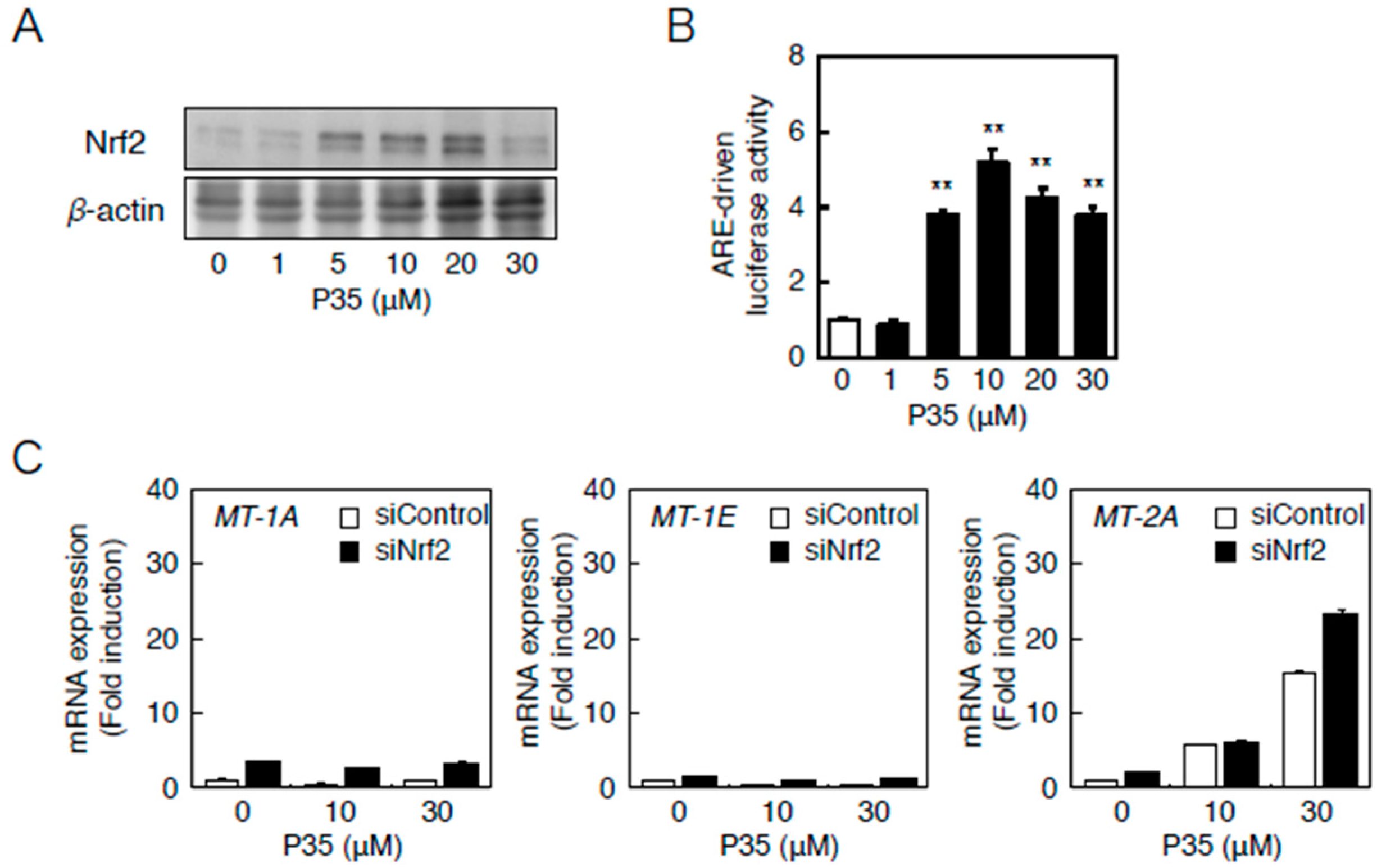 Similarly, P35 activated Nrf2 (Figure 8A) and significantly increased ARE-driven transcription in a concentration-dependent manner (Figure 8B). The transcriptional induction of MT-2A by P35 was, however, unaffected in a siRNA-mediated knockdown of Nrf2 (Figure 8B), indicating that the Nrf2–ARE pathway does not transactivate MT-2A induction.
