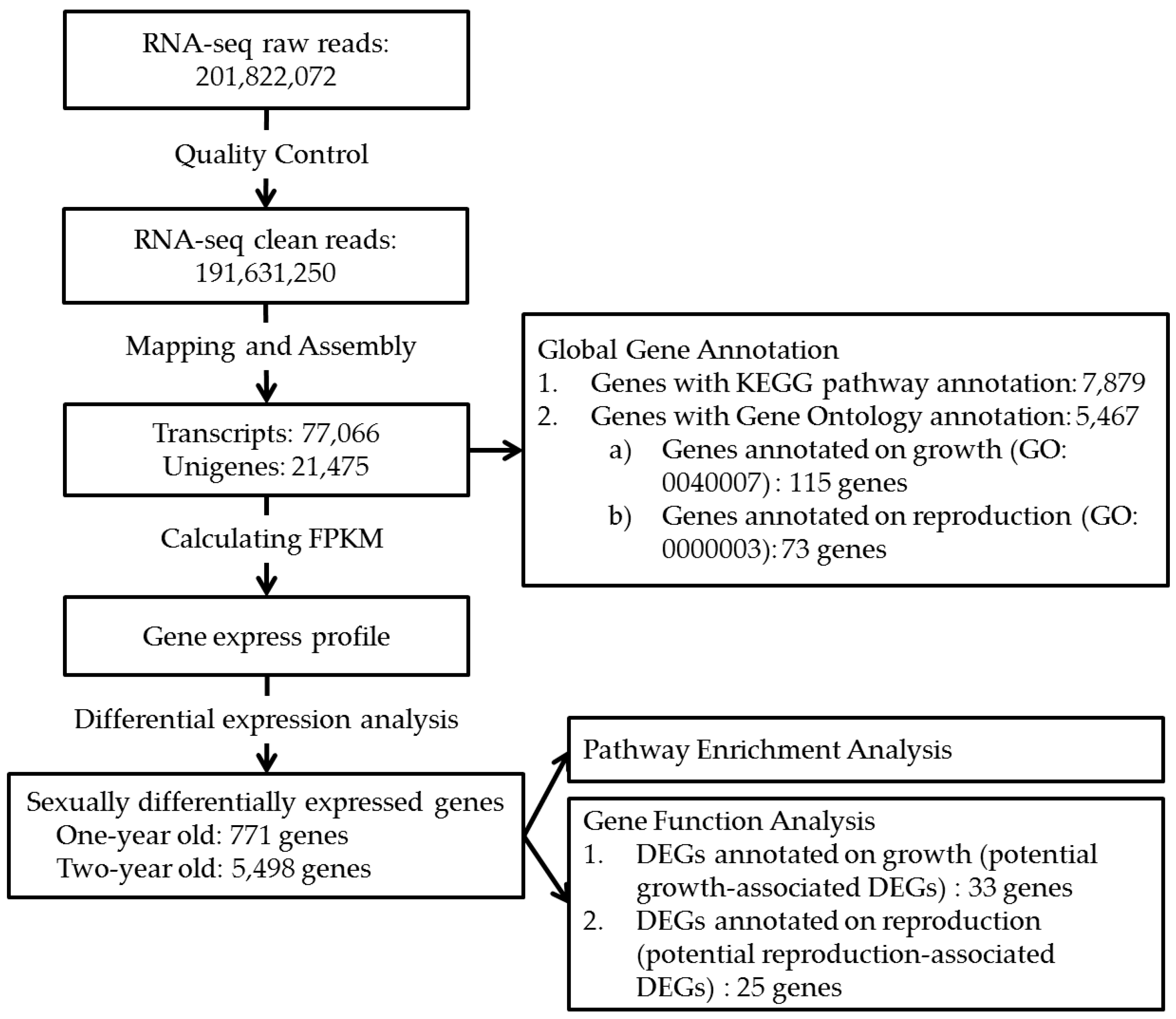 To obtain comprehensive information of gene expression between sexes, we sequenced four transcriptomes derived from female and male brains at one and two-year-old tongue sole by using Illumina Hiseq2000 technology. A workflow with the transcriptome data analysis procedures is shown in Figure 1.