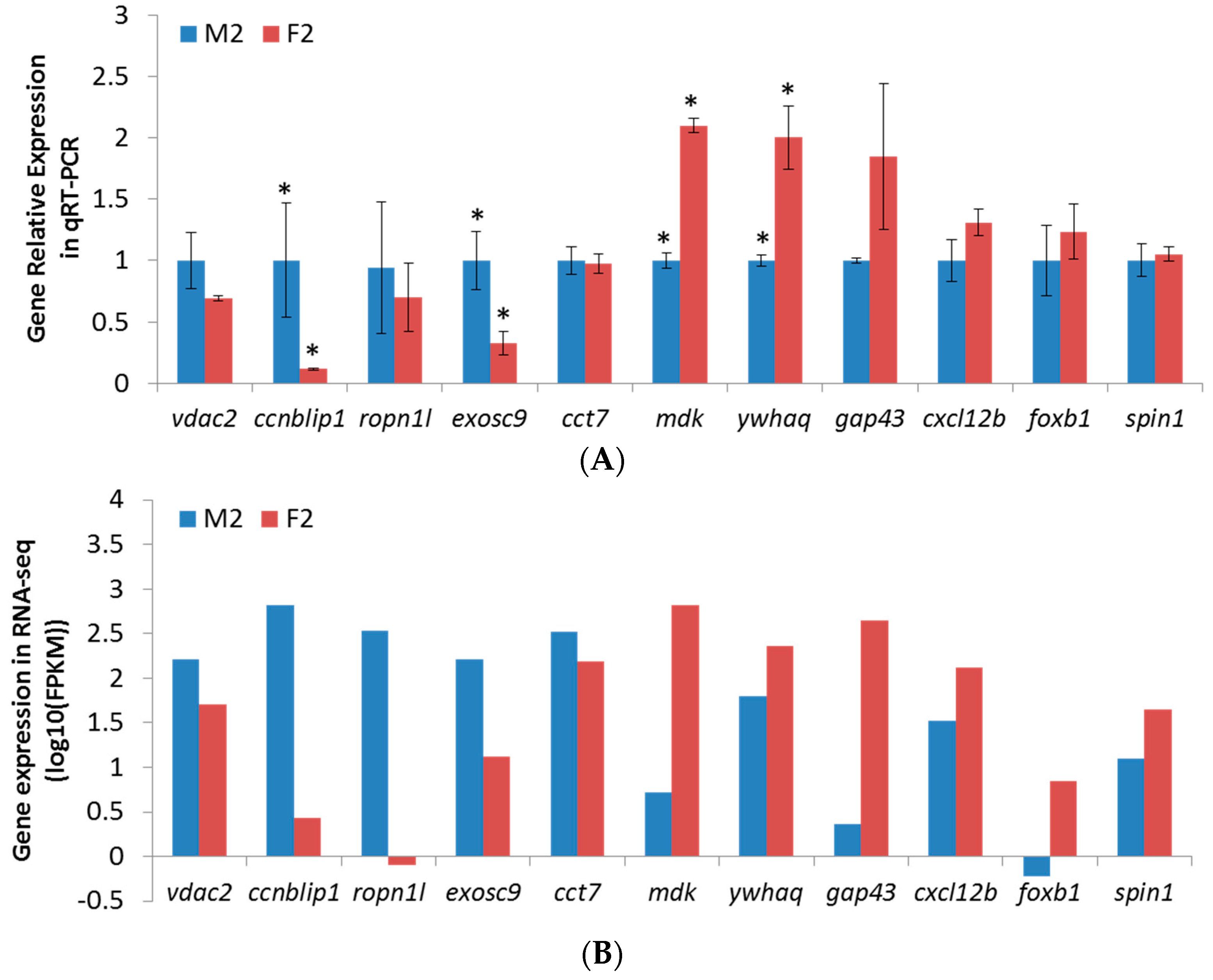 In order to validate the expression pattern of DEGs identified by RNA-Sequencing, we randomly selected eleven genes from DEGs potentially associated with growth or reproduction (Table 2 and Table 3) for qPCR validation, including vdac2, ccnblip1, ropn1l, exosc9, cct7, mdk, ywhaq, gap43, cxcl12b, foxb1 and spin1. M2 was used as the reference in 2−∆∆Ct method to calculate the relative gene expression level. Comparing the relative expression level of eleven selected genes, most results of qPCR were consistent with the results of RNA-Seq (Figure 3). The Pearson’s correlation of log10(fold-change) between qPCR and RNA-Seq was 0.80, indicating the accuracy and reliability of RNA-Seq based transcriptome analysis.