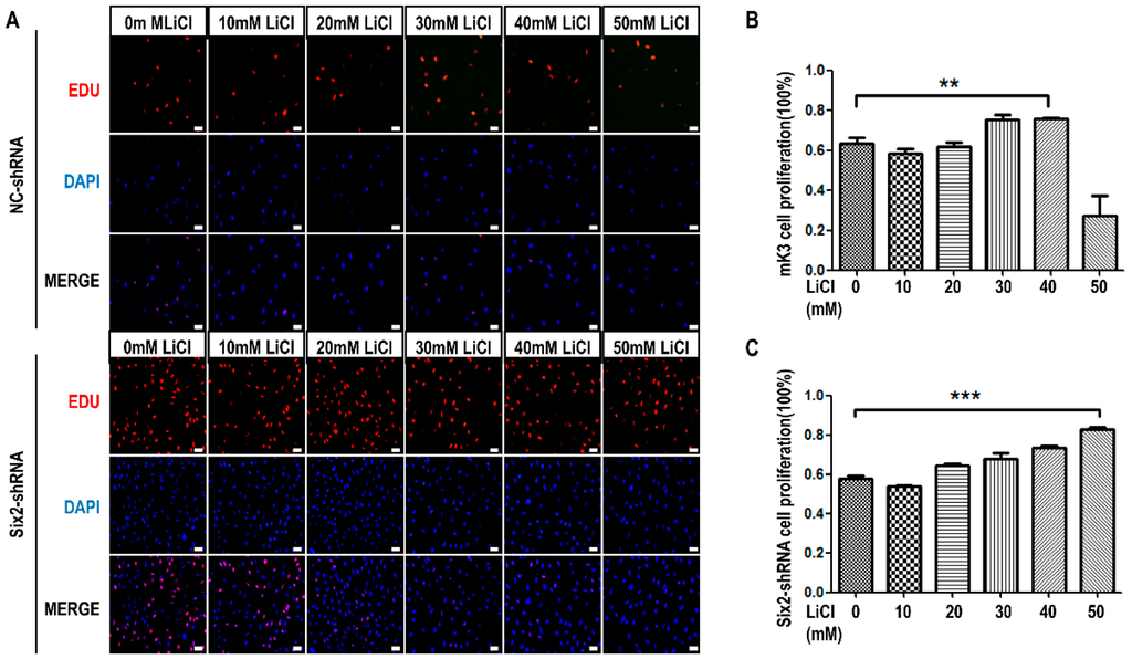 Knockdown of Six2 gene inhibits cell proliferation while LiCl treatment of low-concentration promotes cell proliferation in mK3 and mK4 cells. (A) mK3 cells were transfected with negative shRNA control and Six2-shRNA for 36 h and treated with LiCl of increasing dosages for 12 h. Proliferating mK3 cells were labeled with EdU (red) and cell nucleus were stained with hoechst (blue). The EdU results were accessed by fluorescent microscope (200×) with the scale bar representing 20 μm and the respective pictures were merged to the purple one; (B,C) Statistical analysis of cell proliferation. Values were presented as mean ± SEM (n = 3), ** p < 0.01, *** p < 0.001 relative to control; (D) mK4 cells were transfected and were detected by EdU assay as same as mK3 cells in (A); (E,F) Statistical analysis of cell proliferation. Values were presented as mean ± SEM (n = 3), ** p < 0.01 relative to control.