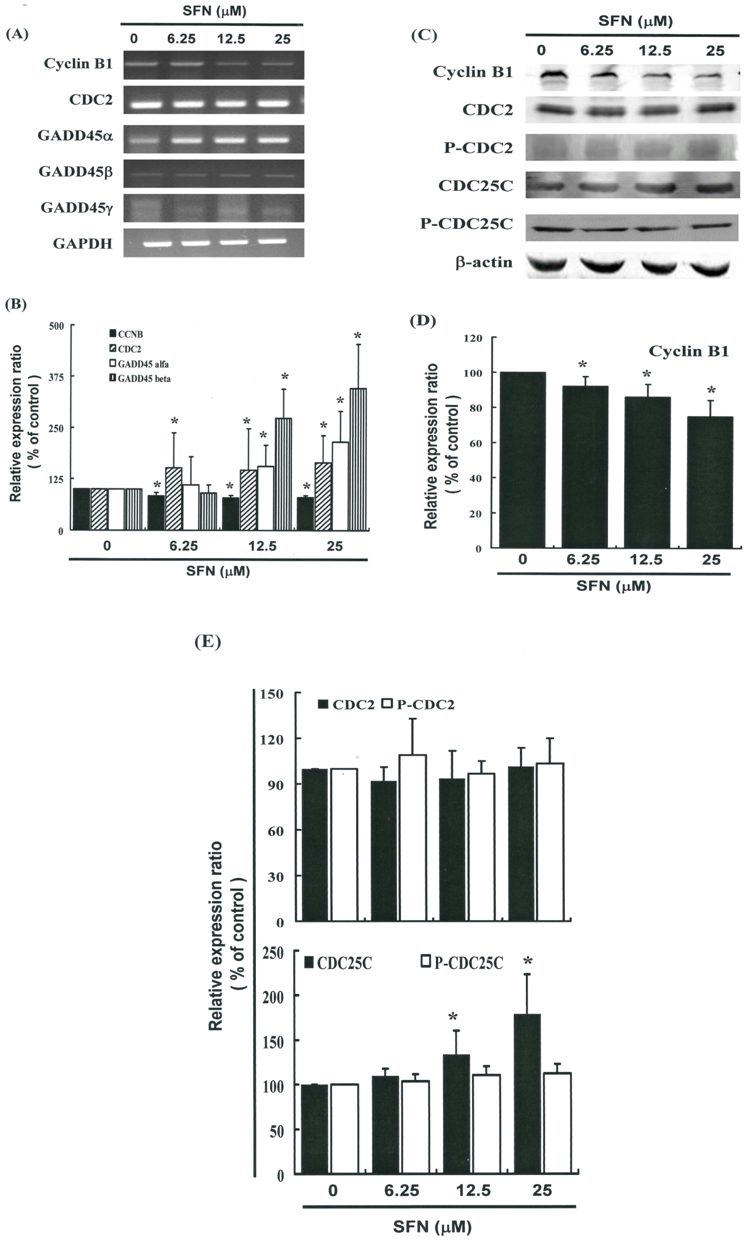 SFN represses cyclinB1 and up-regulates GADD45β gene expression in HeLa cells. The cells were treated with SFN (0, 6.25, 12.5, and 25 μM) for 24 hours, and gene expression was subsequently detected by RT-PCR, quantitative RT-PCR (qPCR) and Western blot analysis. (A) RT-PCR results for cyclin B1, CDC2 and, GADD45 family mRNAs in HeLa cells following exposure to SFN; (B) The panels show qPCR analysis of mRNA expression in cyclin B1, CDC2, GADD45-α, -β and -γ; (C) Representative blot from 3 independent experiments; (D,E) Quantification of band intensities. All data is reported as the mean (±SEM) of at least three separate experiments. Statistical analysis was performed using a t-test, with differences considered significant at a level of * p < 0.05 versus the 0 μM control group.