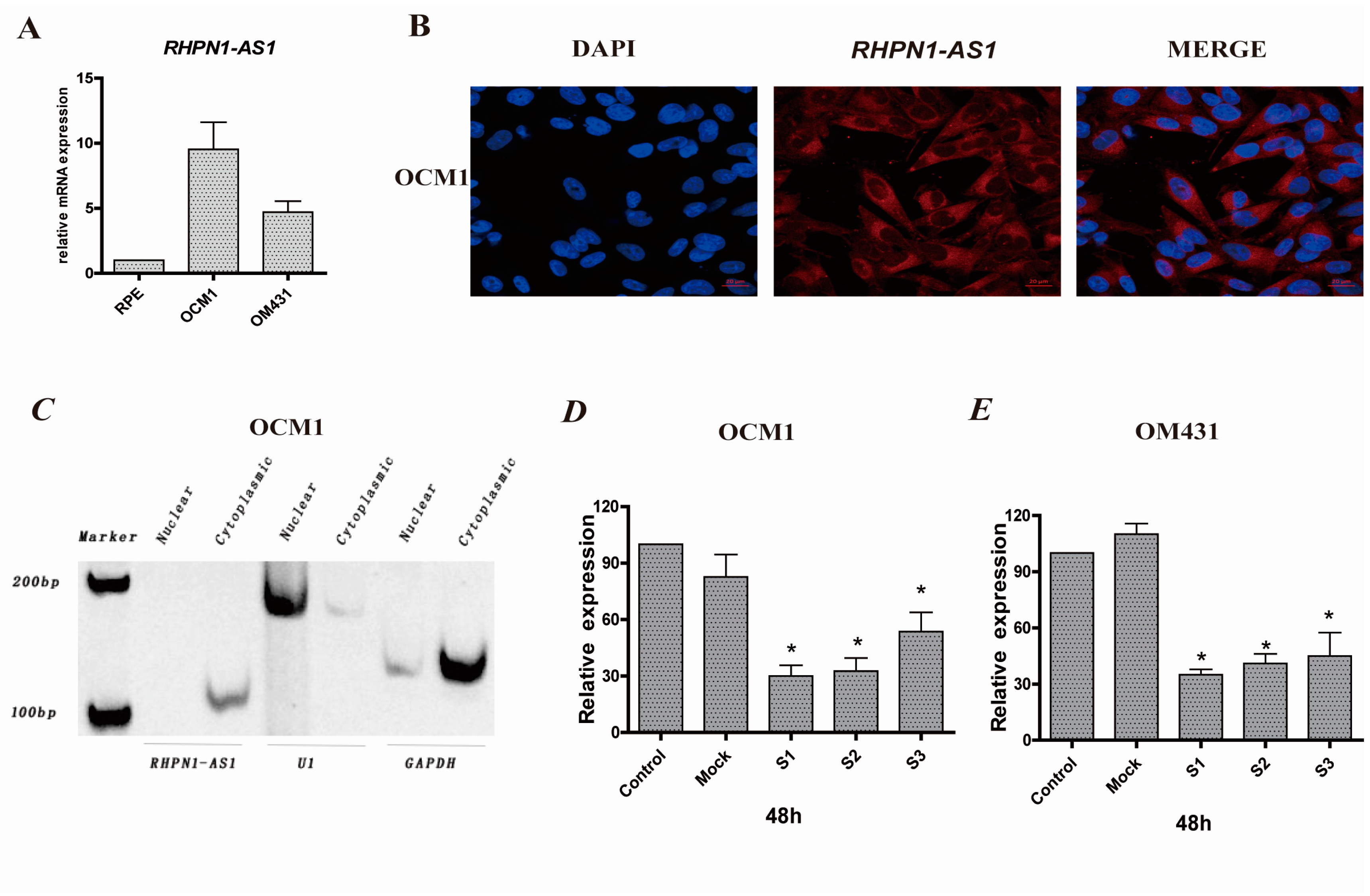 RHPN1-AS1, a cytoplasmic lncRNA, is aberrantly expressed in UM cell lines. (A) RHPN1-AS1 expression was measured by real-time PCR in different UM cells and normal cell (RPE). RHPN1-AS1 presented higher expression in melanoma cell lines OCM1 and OM431 than RPE cells; (B) RHPN1-AS1 is cytoplasmically distributed. RNA fluorescence in situ hybridization (FISH) (red) was performed with cy3-labeled probes that recognizing RHPN1-AS1. The scale bars represent 20 µm; (C) RHPN1-AS1 is associated with the cytoplasmic fractions. Total RNAs from OCM1 cells were separated into cytoplasmic and nuclear soluble fractions. U1, GAPDH were used as controls; (D,E) The interference rate was detected 48 h after RHPN1-AS1 siRNAs transfection in OCM1 and OM431 cells. Triplicate assays were performed for each sample and the relative level of RHPN1-AS1 was normalized to the GAPDH. (* p < 0.05).