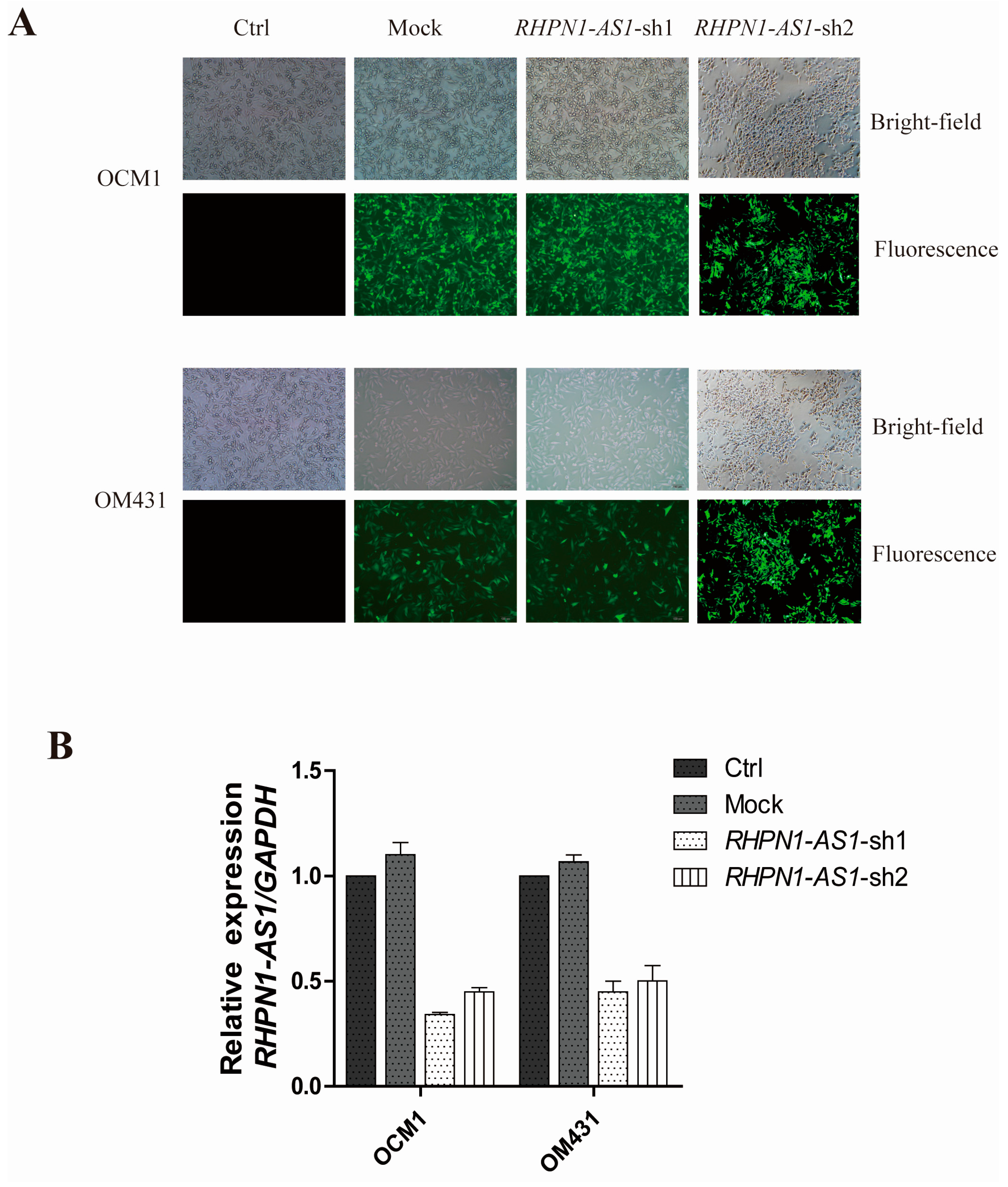 RHPN1-AS1 knockdown by two shRNAs: (A) EGFP was used to track the expression of RHPN1-AS1 shRNAs and control vectors in OCM1 and OM431 cells. The scale bars represent 100 μm; and (B) detection of RHPN1-AS1 mRNA level in OCM1 and OM431 cells after shRNA-mediated knockdown of RHPN1-AS1 by qRT-PCR.
