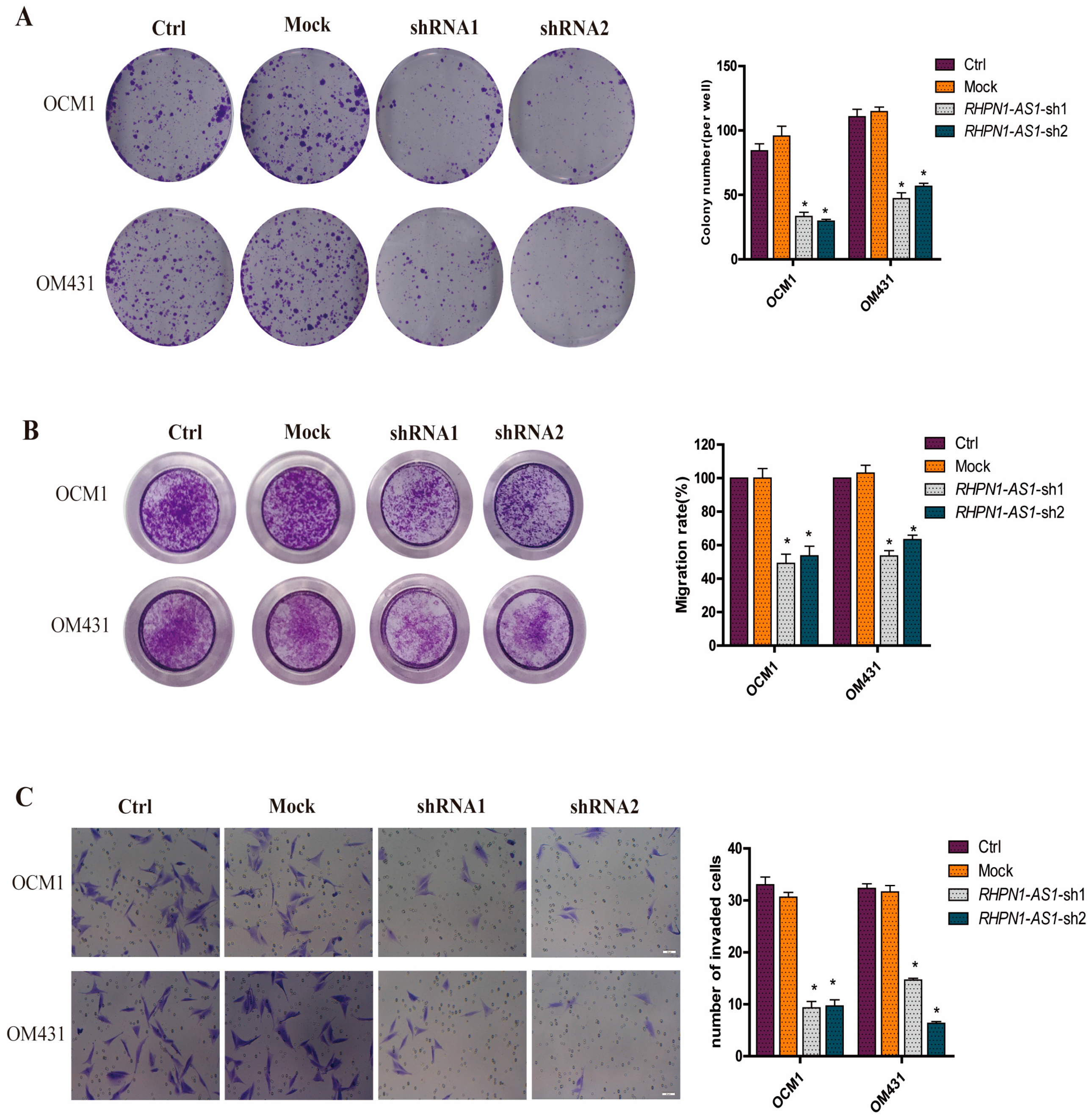 Knockdown of RHPN1-AS1 inhibits proliferation, migration and invasion of UM cells in vitro. (A) Colony formation assays were performed to evaluate the effect of RHPN1-AS1 on growth of UM cells after knockdown RHPN1-AS1. * p < 0.05; (B) The effect of RHPN1-AS1 downregulation on the migration ability of OCM1 and OM431 cells was assessed using transwell assay. * p < 0.05; (C) Effects of RHPN1-AS1 knockdown on the invasion potency of OCM1 and OM431 cells were detected using matrigel invasion assay. The scale bars represent 50 µm. * p < 0.05.