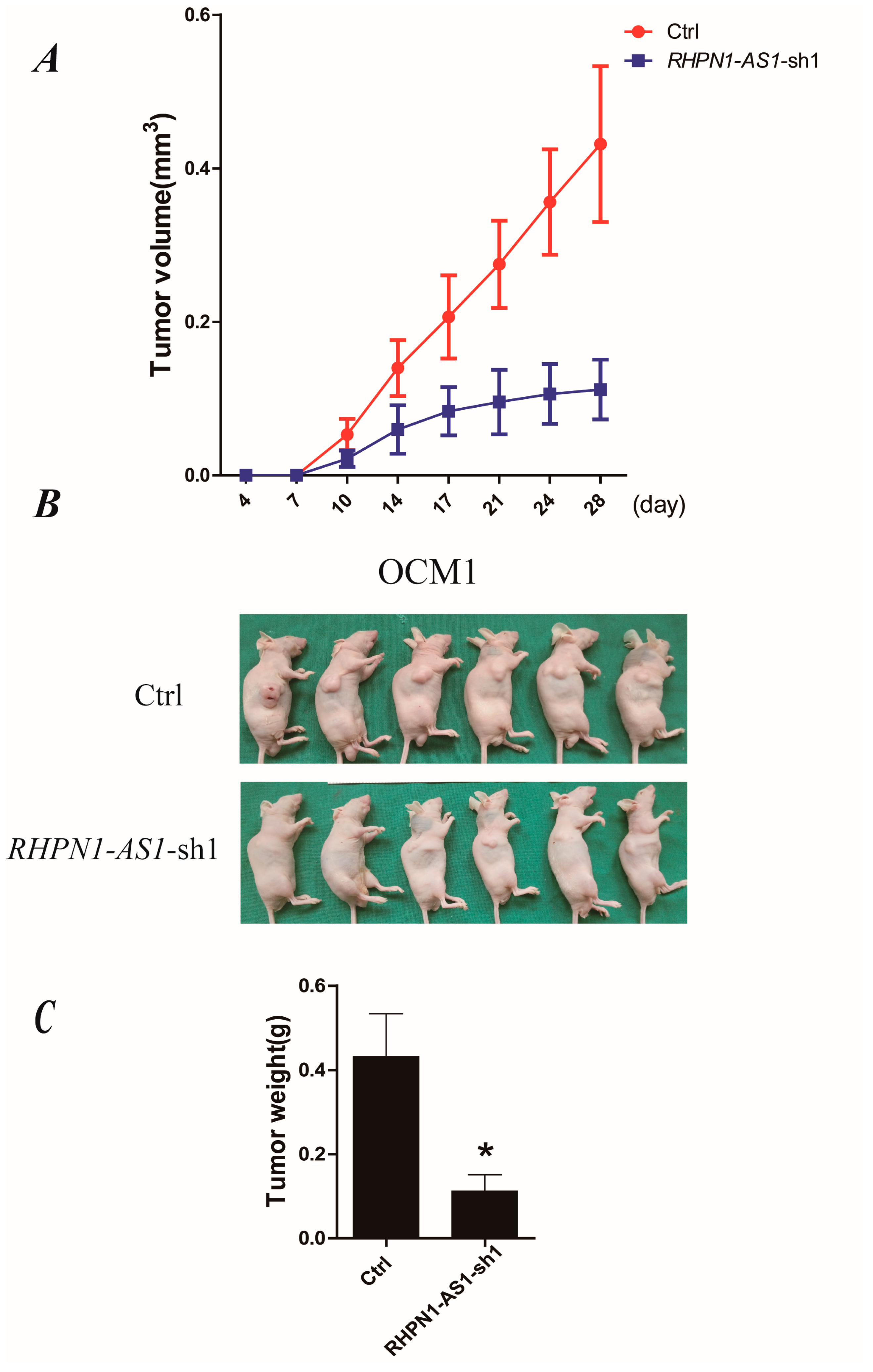 To examine the biological significance of RHPN1-AS1 on tumor growth in vivo, we established a xenograft model in nude mice; 1 × 106 of the control OCM1 or RHPN1-AS1-sh1OCM1 cells were subcutaneously injected into the right flanks of mice. The tumor volume was measured once every 3–4 days. Fourteen days after injection, the tumor growth of RHPN1-AS1-sh1OCM1 cells was significant slower than that of control cells (p < 0.05, Figure 4A). After 28 days, the mice were sacrificed, and the tumors were removed and analyzed (Figure 4B). The average tumor weight of RHPN1-AS1-sh1OCM1 cells was significantly lower than that of the control cells (p < 0.05, Figure 4C). These data indicate that the growth of the tumors was impaired after RHPN1-AS1 knockdown in vivo.