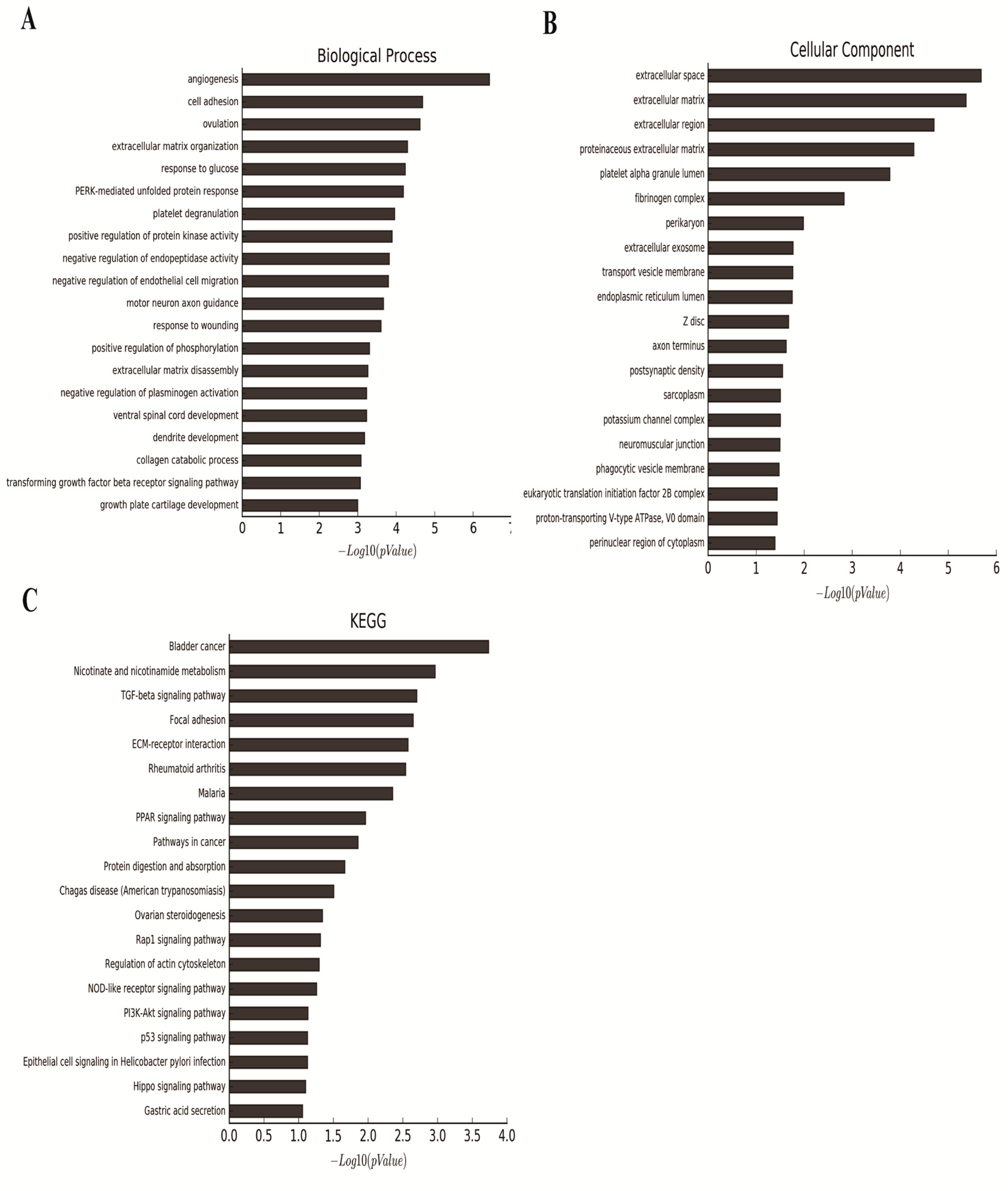 Genome-wide analysis of RHPN1-AS1 targets. (A,B) Significant GOs affected by RHPN1-AS1 silencing. X-axis, negative logarithm of the p value (−Lgp); Y-axis, the Gene Ontology (GO) category; (C) Histogram of signal pathways that were regulated by RHPN1-AS1 silencing. X-axis, negative logarithm of the p-value (−Lgp); Y-axis, the name of the pathway.