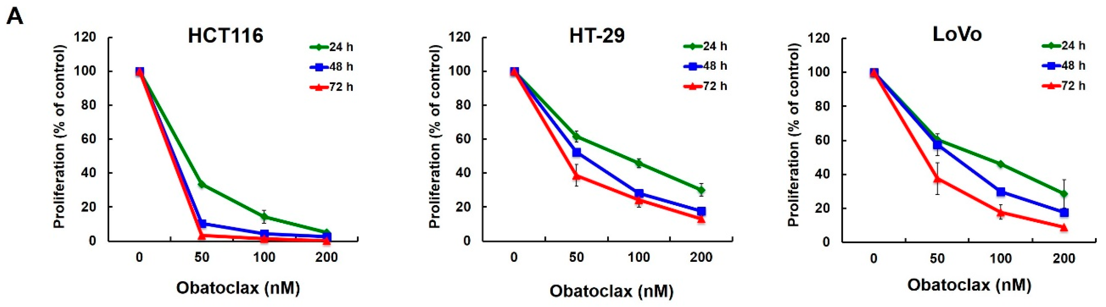 2.1. Obatoclax Inhibits Cell Proliferation and Induces G1 Cell-Cycle Arrest in a Panel of Human Colorectal Cancer Cell Lines