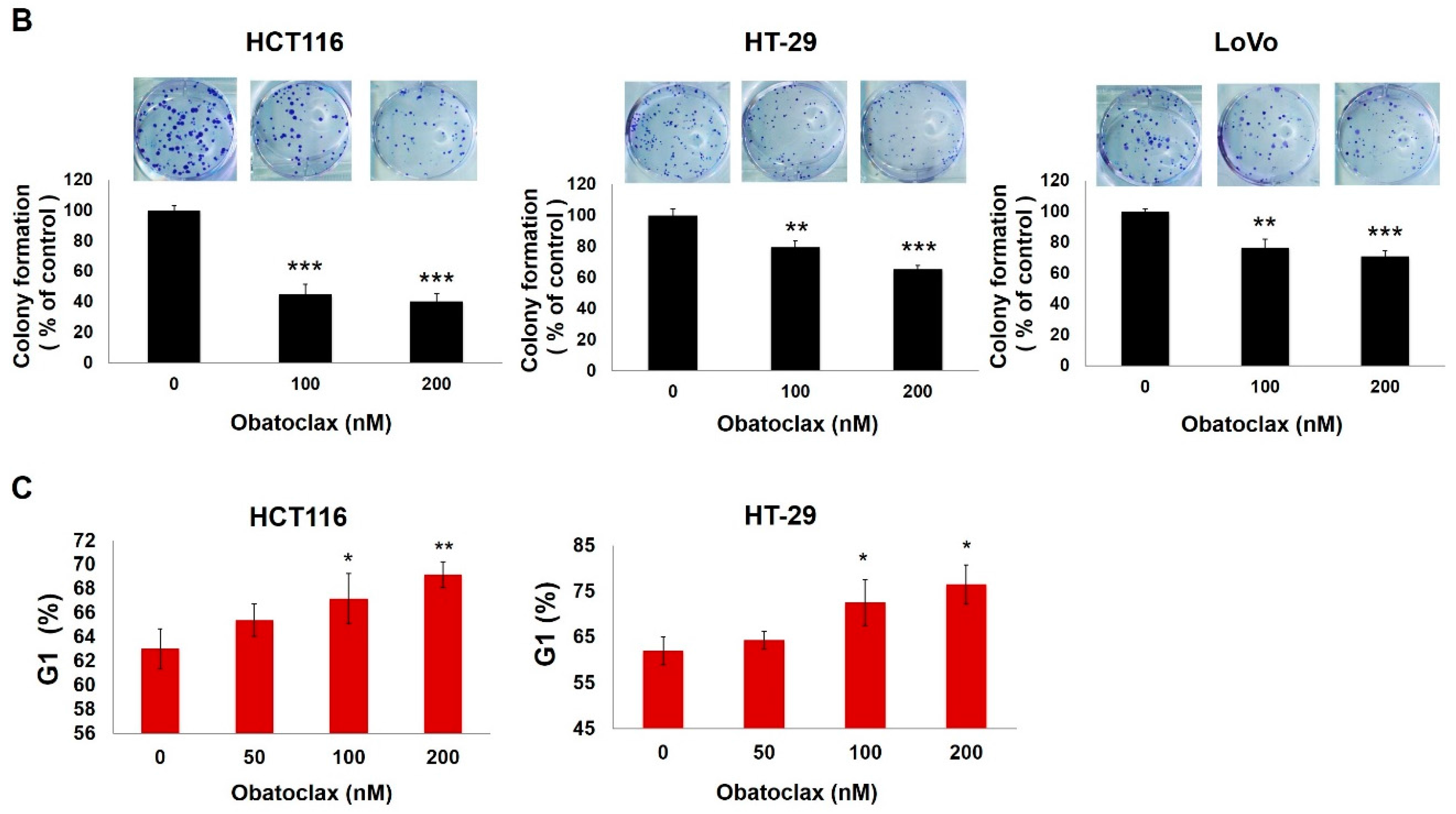 Antiproliferative action of obatoclax on a panel of human colorectal cancer cell lines. (A) Obatoclax inhibits colorectal cancer cell proliferation. Human colorectal carcinoma cell lines HCT116, HT-29, and LoVo cells (4 × 104) were treated with obatoclax (0, 50, 100, 200 nM) for 24, 48, and 72 h. The numbers of cells at each time point were counted using a Neubauer chamber. Data were presented as the percentage relative to the drug-untreated control; (B) Obatoclax suppresses colony formation by colorectal cancer cells. (Upper panel) HCT116, HT-29, and LoVo cells (2 × 102) treated with obatoclax (0, 100, 200 nM) for 24 h were allowed to proliferate in drug-free culture media for 10~14 days to form colonies, followed by crystal violet staining for scoring colonies. Shown here are the representative images from three independent experiments. (Lower panel) Quantitative results of the upper panels. Data were presented as the percentage relative to the drug-untreated control; (C) Obatoclax arrests cell cycle progression at the G1-phase. HCT116 and HT-29 cells were treated with obatoclax (0, 50, 100, 200 nM) for 24 h, followed by flow cytometry analyses to determine the levels of cell population at the G1-phase of the cell cycle. Data were presented as the percentage relative to the drug-untreated control. *: p < 0.05; **: p < 0.01; ***: p < 0.001.