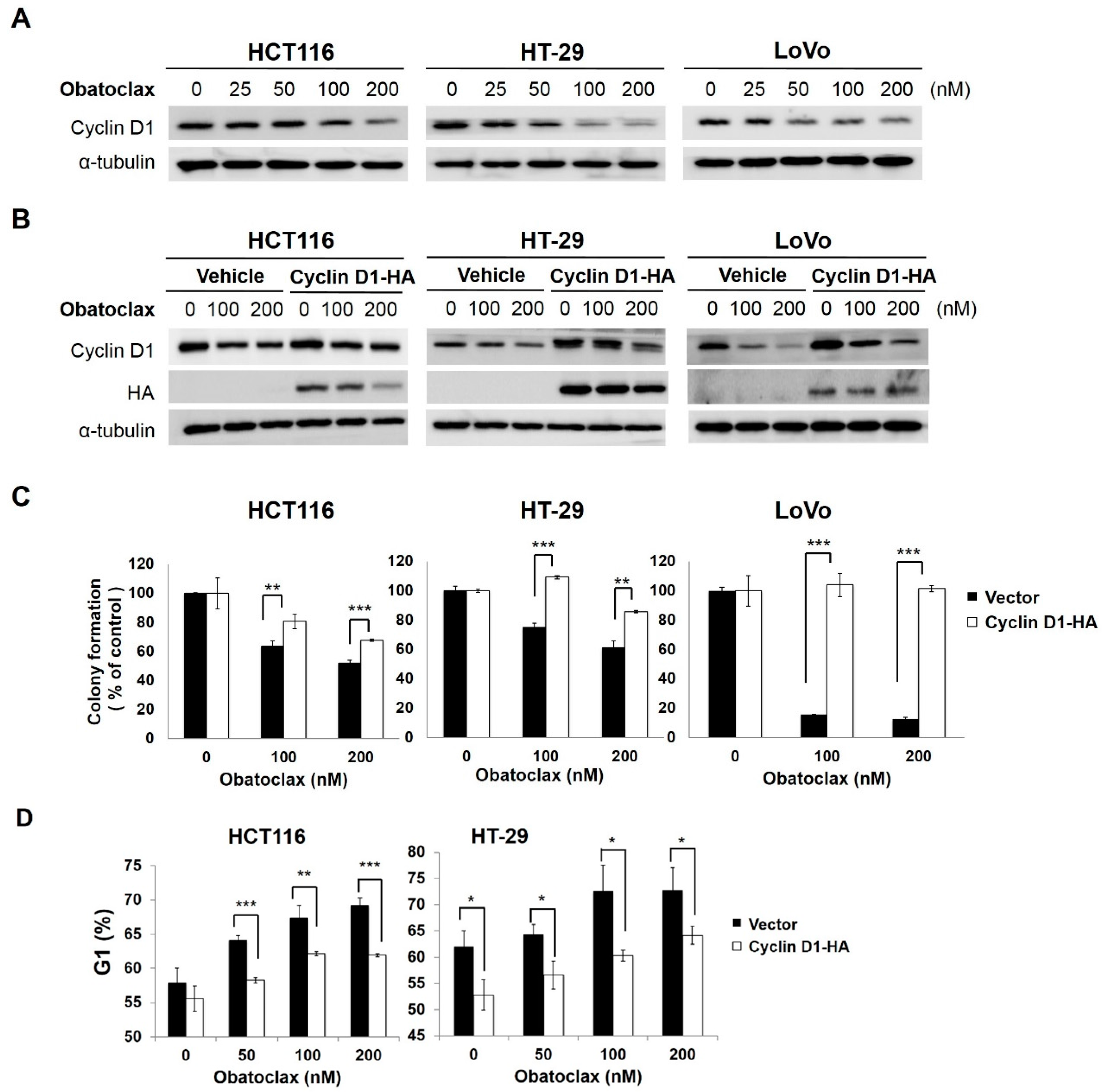 How obatoclax induces G1-phase arrest was next investigated. It is well-established that cyclin D1 is essential for driving G1-to-S transition to promote cell cycle progression. Importantly, cyclin D1 overexpression leads to uncontrolled cell proliferation and is linked to the development, progression, poor prognosis, and chemoresistance of a broad range of human malignancies, including colorectal cancer, thus making cyclin D1 a potential therapeutic target [27,28]. Accordingly, we examined the effect of obatoclax on cyclin D1 expression in HCT116, HT-29, and LoVo cells. Our results indicated a marked drop in cyclin D1 levels following treatment with obatoclax as low as 50 nM (Figure 2A). To further substantiate the functional significance of cyclin D1 downregulation in obatoclax-induced antiproliferation, we established stable clones overexpressing HA (Hemagglutinin)-tagged cyclin D1 to counteract obatoclax-induced reduction of cyclin D1 (Figure 2B). It is noteworthy that in all cell lines tested, ectopic cyclin D1 overexpression rescued the clonogenicity of obatoclax-treated cells (Figure 2C), but also attenuated the levels of obatoclax-elicited G1-phase arrest (Figure 2D). In sum, we conclude that cyclin D1 downregulation appears as a primary mode of action whereby obatoclax provokes G1-phase cell cycle arrest, leading to antiproliferation of colorectal cancer cells.