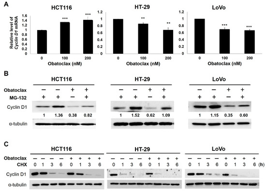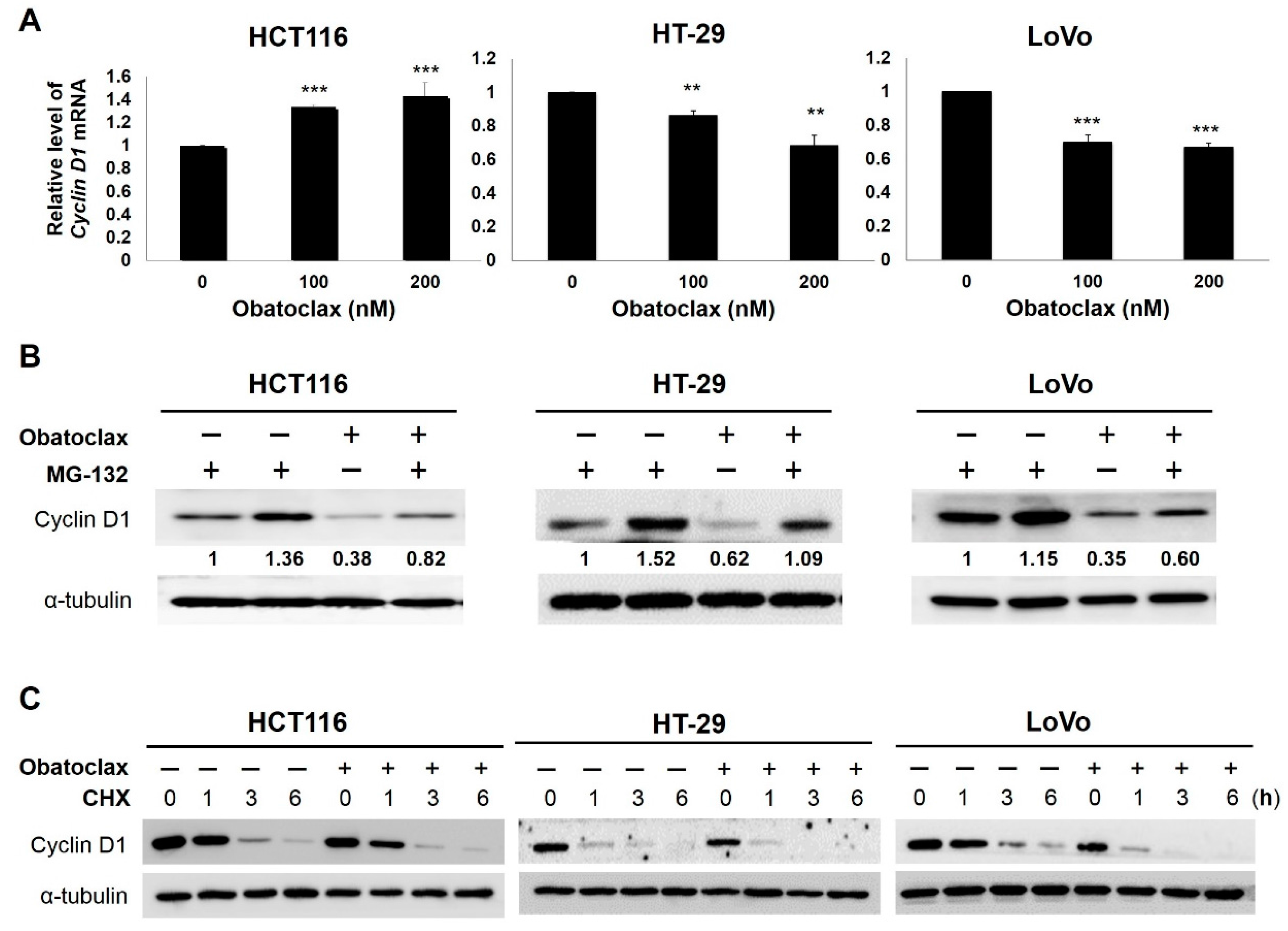 Cycloheximide chase analysis was performed as described previously [56] to define the effect of obatoclax on the stability of cyclin D1 protein. Briefly, HCT116, HT-29, and LoVo cells (5 × 105) were exposed to obatoclax (200 nM) for 18 h, followed by 6 h-treatment with cycloheximide (50 µg/mL) to stop de novo protein synthesis. Cyclin D1 levels at 0, 1, 3, and 6 h following cycloheximide co-treatment were then determined by immunoblotting.