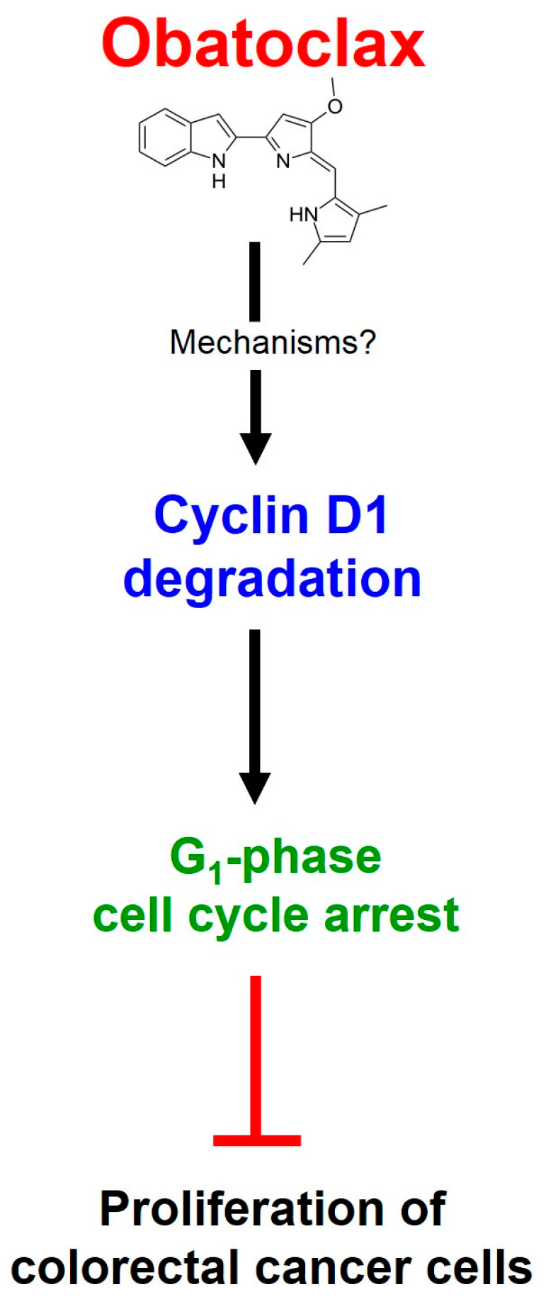 Schematic model depicting the mechanisms of action underlying obatoclax-induced antiproliferation. Obatoclax targets cyclin D1 for proteasome-mediated degradation to downregulate cyclin D1, leading to delayed G1-phase cell cycle progression, and the consequent inhibition of cell proliferation in a panel of human colorectal cancer cell lines.