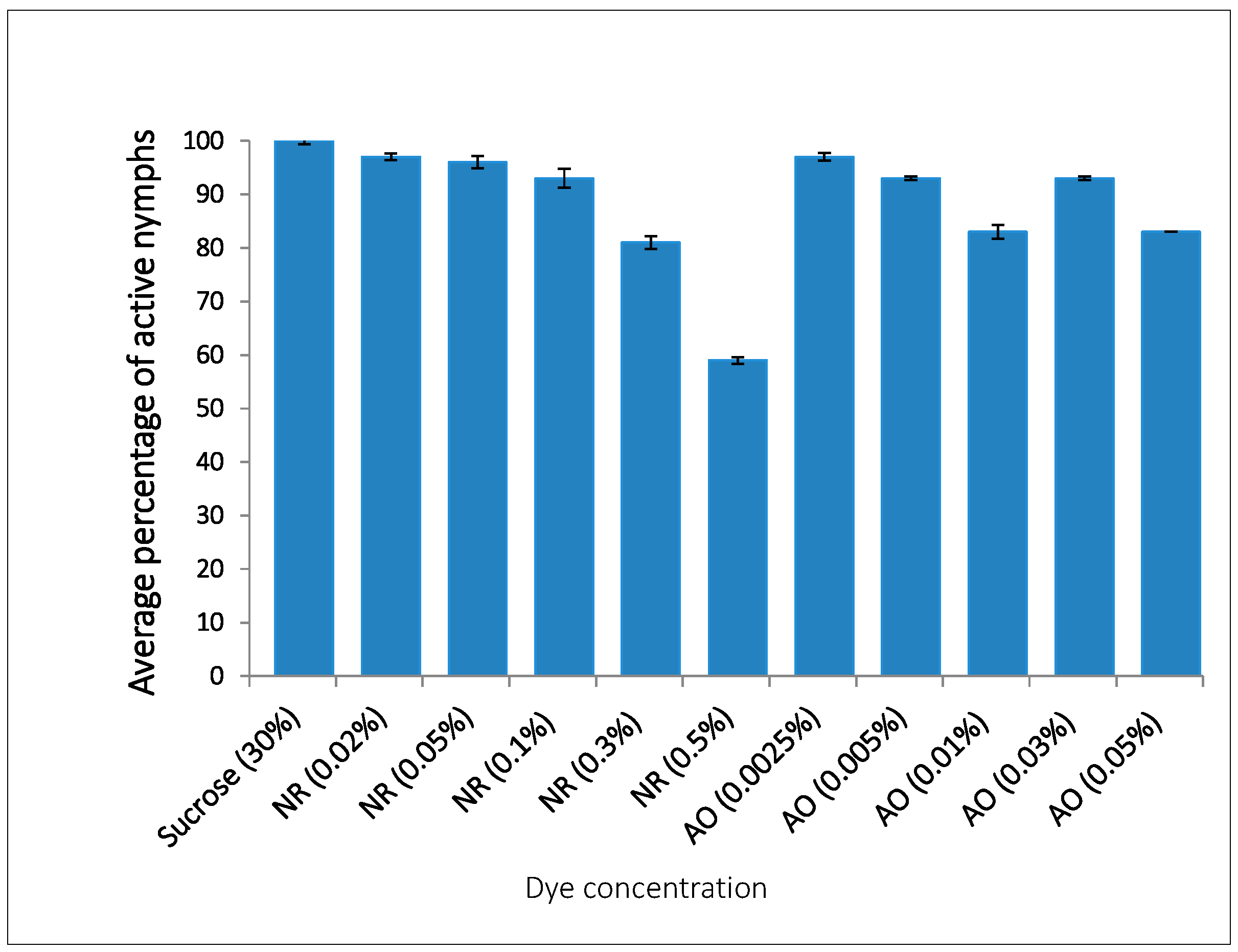Based on the number of aphids that survived after feeding for 24 h and also showed the presence of dye in the stylet, gut and siphunculi, five concentrations of NR and AO were selected for further investigation: the aim was to identify the lowest concentration that could be visualised in aphid bodies when ingested with little or no obvious effect on activity and feeding. Aphid activity was defined in this context and throughout the manuscript as significant response to external stimuli (e.g., touch with a paint brush) reflected in movement including but not restricted to change in direction of movement or a jolt or twitch or raising or lowering of the antennae within one minute of application of the stimulus—aphids which did not exhibit such activity were classified as inactive. This study was done because it was important that the appropriate concentration of dye, duration of exposure and stage of development of aphids be empirically determined before the dye was selected for inclusion in an artificial feed with dsRNA. Three replicates of 10 aphids, which fed from feeding sachets were analysed for each concentration. After 24 h, the nymphs had taken up feed with all concentrations of the dyes as evidenced by the stains in the bodies (Table 2). For both dyes, the highest numbers of live and active nymphs that showed the presence of dye was recorded for the lowest concentrations i.e., 0.0025% for AO and 0.02% for NR (Table 2), an indication that higher concentrations of the dyes may affect activity of the aphids. However, there were significantly more active aphids when exposed to the lowest concentrations of both dyes (p < 0.05) (Table 2 and Figure 2). The results indicate that at these concentrations, the dyes were not toxic to the aphids at least during the 24 h following ingestion as the number alive and their activity were not significantly different from those fed 30% sucrose alone. It was observed that the nymphs were attracted to sucrose because more ingested the feed of 30% sucrose with dyes and had visible dye in body than was the case for aphids exposed to feed with dye present in water (Table 2 and Figure 2).