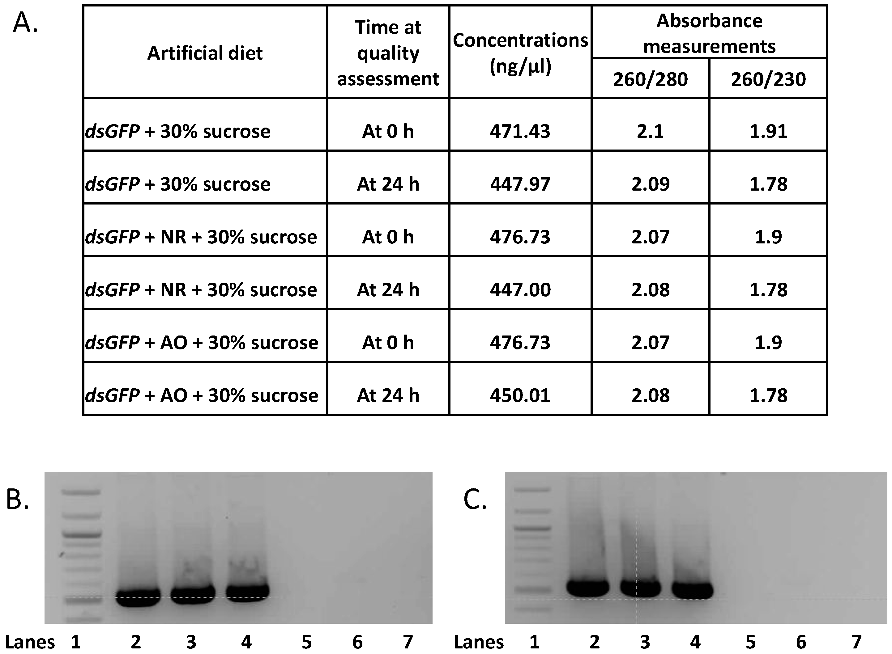 The lowest concentrations of NR (0.02%) and AO (0.0025%), for which there were more active aphids with dye in the body after 24 h of exposure, were used to determine if the quality of dsRNA was affected 24 h after it was mixed with 30% sucrose and the dyes. Two replicates each of three treatments of artificial diets each comprising 50 µL of 30% sucrose and 500 ng of a 524 bp-long dsRNA corresponding to the green fluorescent protein (GFP) of Aequorea victoria, were made, one with AO at 0.0025%, another with NR at 0.02% and a third with no dye added. The feeding sachets were kept at 23–24 °C for 24 h after which the integrity of the dsRNA before mixing with the dyes and 24 h later was assessed using spectrophotometric analysis and gel electrophoresis. The ratio of absorbance at 260 nm and 280 nm was used as a primary measure of nucleic acid purity: 2.0 is generally regarded as ideal for pure RNA. This ratio for the dsRNA in the three treatments were similar before and after mixing with the dyes thus indicating the purity of dsRNA did not change when mixed with 30% sucrose and the concentrations of AO and NR used during the 24 h period (Figure 3A). On the other hand, the ratios of absorbance at 260 nm and 230 nm (a secondary measure of nucleic acid purity) were slightly lower than the optimal for pure RNA which is between 2.0 and 2.2 (Figure 3A). This decrease is perhaps due to the absorbance of sucrose and/or the dyes at 230 nm. When electrophoresed on a 2% agarose gel at 70 V, a significant proportion of dsRNA from all treatments was intact 24 h after mixing with both AO and NR dyes (Figure 3B,C). Although there appears to be a slight smearing of dsGFP the intensities of the bands, before and after mixing with both AO and NR, were sharp indicating there was insignificant change in the integrity of the dsRNA for the 24 h during the experiment.