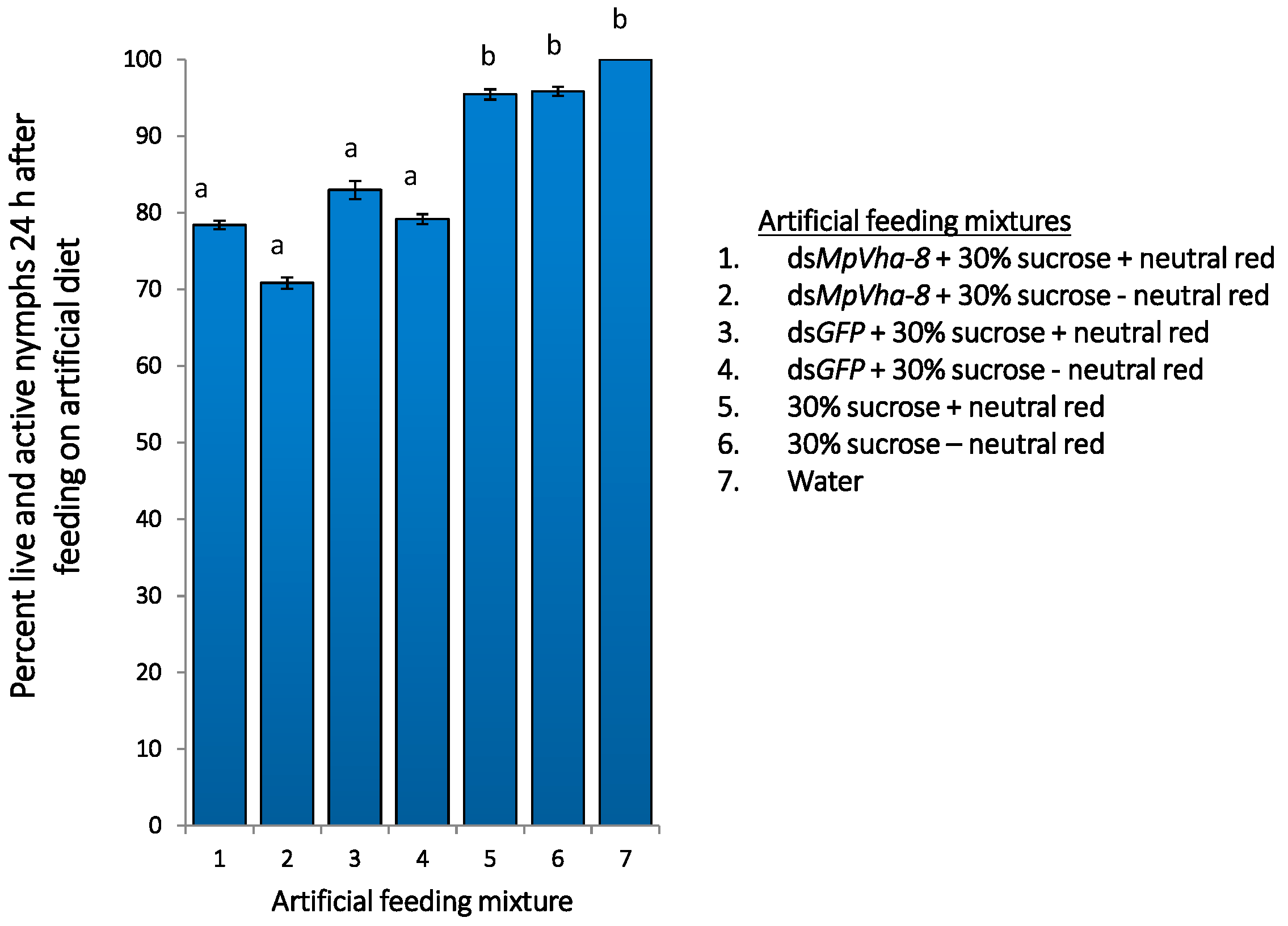 For treatments with dye, over 80% of nymphs migrated towards the feed within 30 min of the experimental set-up, compared to nymphs presented with feed without dye, indicating the dye attracted the insects to the feed. On average 11 out of 12 aphids for each treatment with dye had the gut and stylet stained after 24 h. Aphid activity and changes in behaviour were observed after 24 h feeding. There was no significant difference in activity of aphids fed the three control diets without dsRNA (p < 0.05, Figure 5). In addition, addition of the dye to the feed did not seem to affect activity of the aphids as the proportion of live and active aphids after 24 h of feeding from similar mixtures with and without the dye were not significantly different (p < 0.05) (Figure 5). However, aphid activity was significantly reduced when fed on dsMpVha-8 mixed with neutral red (78.4% alive and active) and without dye (70.8% alive and active) compared to the number of live and active nymphs from all the three no-dsRNA and dsGFP controls (p < 0.05, Figure 5).