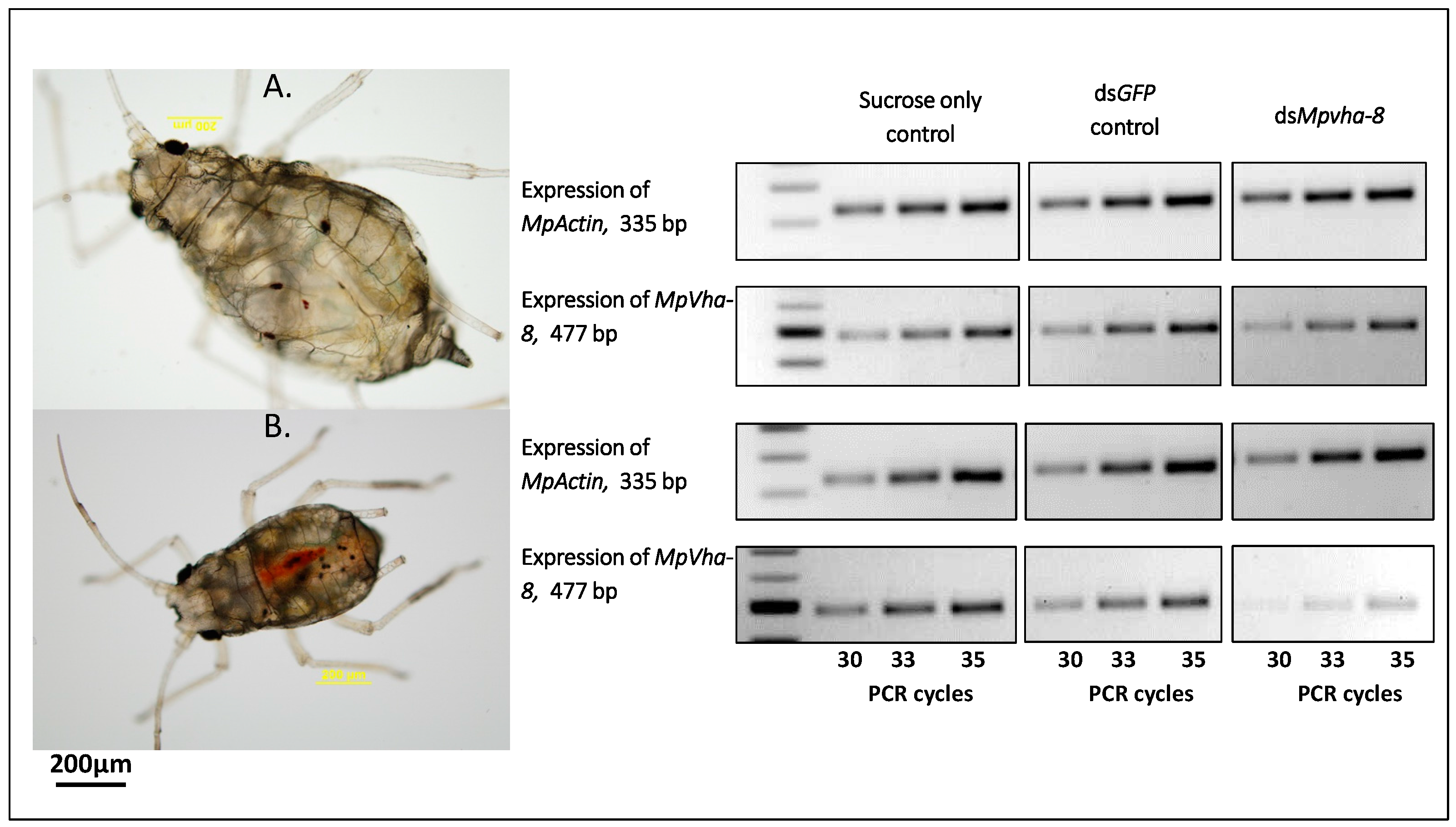 Insect pests cause direct and indirect damage to crops and are responsible for millions of dollars of losses in crop production worldwide [1]. Aphids (Hemiptera: Aphididae) are the largest group of insects that predominantly feed on plant phloem sap. Heavily infested plants are usually stunted, weak, and have reduced photosynthesis that can result in reduced crop yields. Of the 4700 aphid species described to date, more than 190 have been proven to transmit plant viruses to most of the world’s important crops [1,2]. The green peach aphid (GPA), Myzus persicae (Sulzer), is a polyphagous insect which feeds on plants from over 40 different families including Brassicaceae and Solanaceae and is also a vector for more than 100 viruses [1,3]. These characteristics, combined with its cyclical parthenogenesis, telescoping of generations and recent outbreaks of resistance to chemical insecticides, make GPA a successful pest [4,5,6]. This makes it imperative to look for other strategies for its control, which may also be more sustainable and environmentally friendly. RNA interference (RNAi) is used widely as a tool to study gene function and is being explored as an alternative strategy for crop protection against several different plant pathogens and pests including nematodes and some insects [7,8,9,10].
