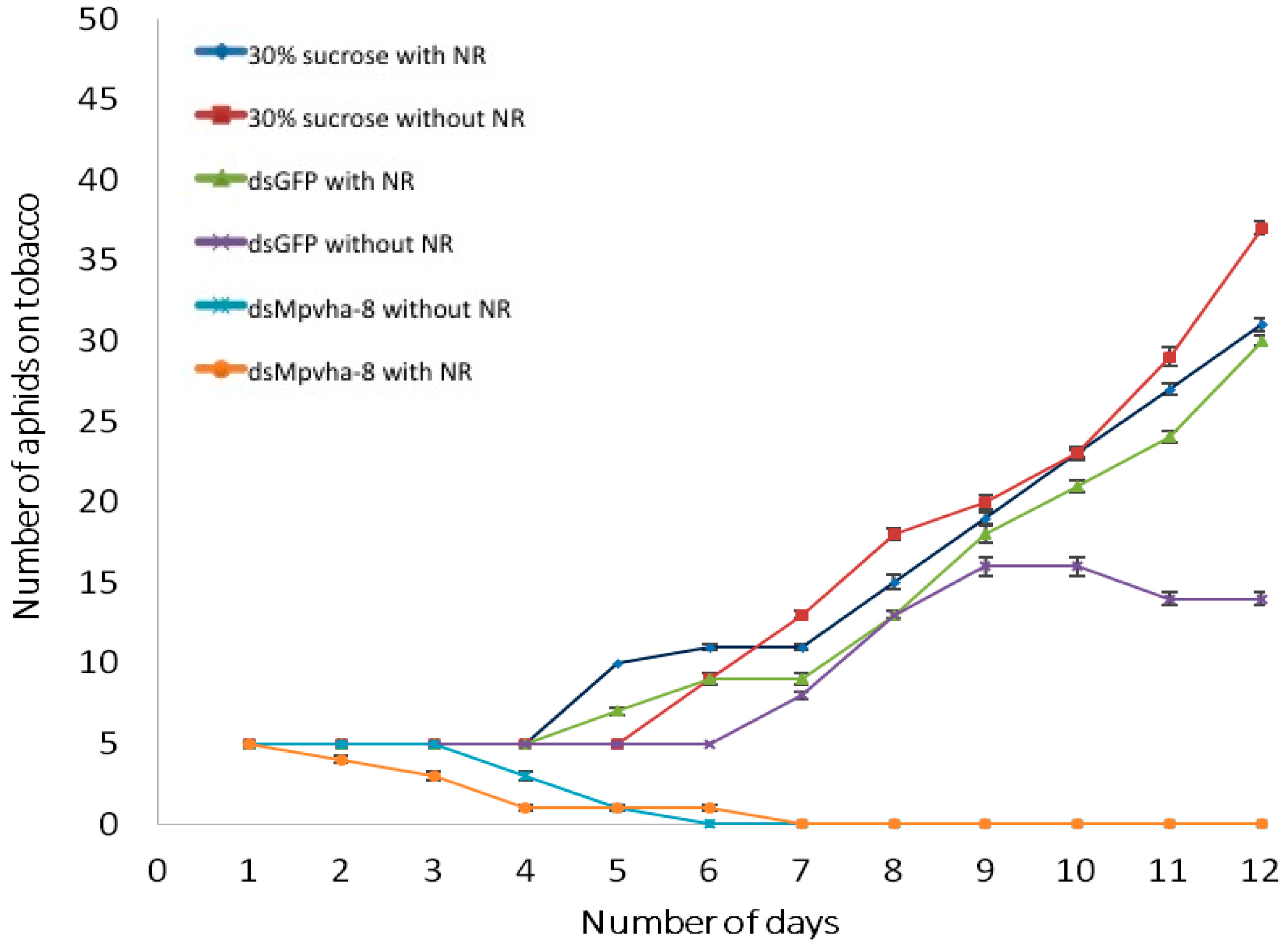 To determine longer-term effects of ingesting dsMpVha-8 on aphid survival and reproduction, and whether this effect was more pronounced in aphids with visible evidence of ingesting dsRNA, five live aphids with dye in the stylet or gut after feeding on each of dsMpVha-8, dsGFP, and sucrose alone (without dsRNA), and five from similar treatments without dye were transferred to tobacco plants, one per plant and their development and reproduction monitored over 12 days. On average nymphs fed 30% sucrose alone reproduced five days after transfer onto tobacco plants while it took six days for aphids fed dsGFP to reproduce (Figure 7). In contrast, for aphids fed dsMpVha-8 (with or without dye) the primary aphid died by the 6th day. For aphids fed with dsMpVha-8 with dye, a steady decline in aphid numbers was obvious one day after they were transferred onto tobacco plants, where 20% died, and by the third day approximately 20% of the initial aphids remained active on plants. Mortality of aphids fed on dsMpVha-8 (without dye) was not as dramatic: it took until the 3rd day to observe any death (40% of the total). This result is similar to reported gene silencing effects on several insect species where oral ingestion of different sizes and amounts of dsRNAs of V-ATPase subunits cause gene knockdown, resulting in negative impacts on growth and development, and in some cases mortality in insects such as D. virgifera virgifera, Leptinotarsa decemlineata, Drosophila melanogaster, Tribolium castaneum, A. pisum and Manduca sexta and B. tabaci [7,37,43,44]. The reduced reproductive rate of aphids after ingestion of dsRNA of vha-8 and the demonstration that feeding on transgenic plants expressing hairpins of the vha-8 gene has a similar effect on B. tabaci, D. virgifera virgifera and M. persicae support the theory that RNAi has the potential to be developed as a pest control strategy which can contribute to existing pest management strategies to reduce the extensive damage caused by insects to agriculture.