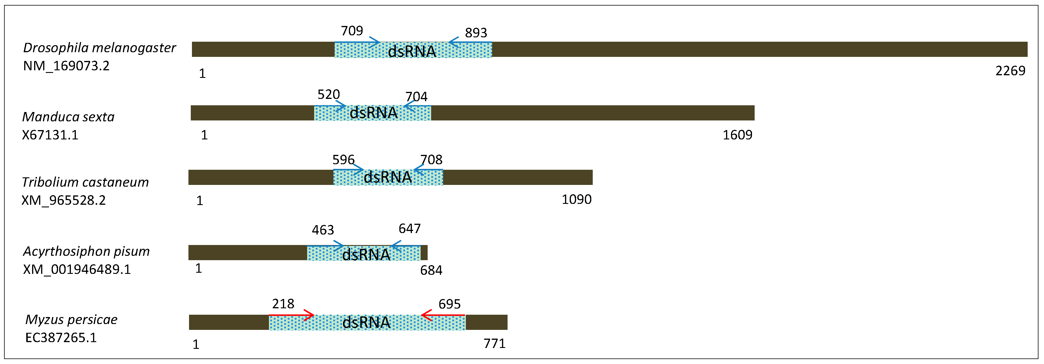 - Gu, L.; Knipple, D.C. Recent advances in RNA interference research in insects: Implications for future insect pest management strategies. Crop Protect. 2013, 45, 36–40. [Google Scholar] [CrossRef]