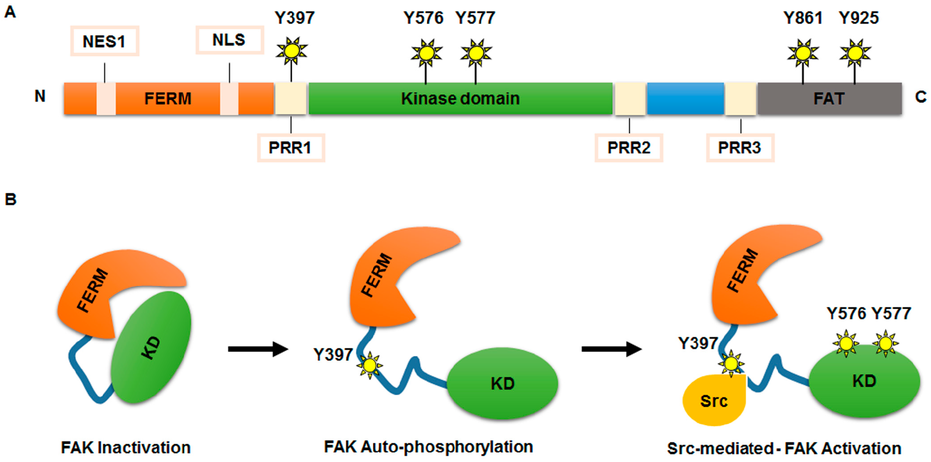 FAK protein structure and activation. (A) Schematic representation of the FAK protein structure. The N-terminal domain comprises a FERM domain, a nuclear export sequence 1 (NES1), a nuclear localization sequence (NLS) a proline-rich region (PRR1) and a 397-tyrosine auto-phosphorylation site (Y397). The central kinase domain contains Y576/Y577 phosphorylation sites, crucial for the kinase activity of FAK. The C-terminal domain includes a focal adhesion targeting (FAT) sequence and two proline regions (PRR2 and PRR3), which are important for binding with several molecular regulators and effectors. In C-terminal domain Y861 and Y925 phosphorylation sites are also included; (B) model of FAK activation. FERM domain binds to the central kinase domain maintaining FAK into an inactive form. Auto-phosphorylation at Y397 site removes FAK inhibition. Src kinase binds FAK at phosphorylation Y397 site generating a FAK-Src signalling complex, which contributes, after phosphorylation of Y576 and Y577 residues, to full activation of FAK activity.