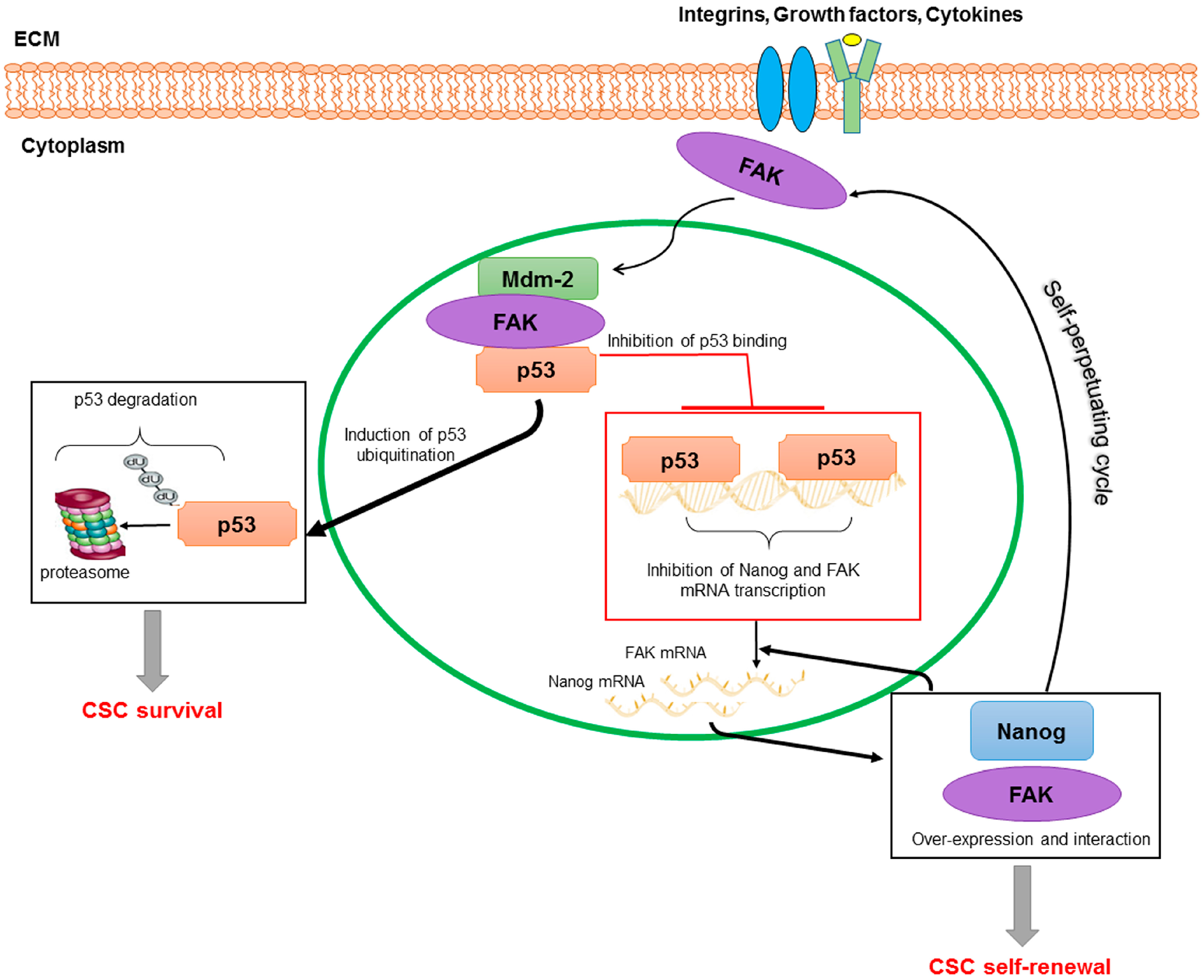 A model of regulation of CSCs based on p53/Nanog/FAK cross-linked-signalling. FAK may translocate into the nucleus where interacts with p53 and Mdm-2. This interaction causes p53 ubiquitination and consequent degradation via proteasome; and reduces p53 binding and repressive activity on Nanog and FAK promoters. In this way, Nanog and FAK over-expression, as well as their function and physical interaction, are self-perpetuated promoting CSC survival and self-renewal.