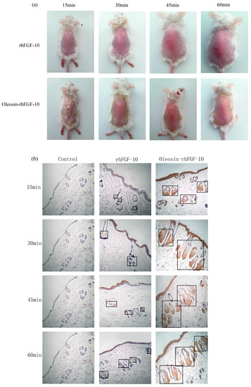 The ability of oleosin-rhFGF-10 to penetrate the skin. (a) The effectiveness of drug absorption into skin at different times, as evaluated by photography; (b) skin sections were stained for oleosin-rhFGF-10 by immunohistochemistry. The positive protein is stained brown and is marked by the black boxes; (c) the western blotting quantification method for objective evaluation in skin. The images are shown at 400× magnification. *** p < 0.001.